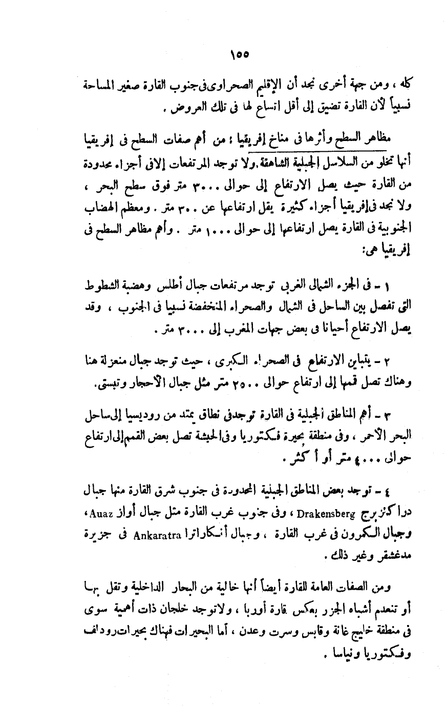 3- أهم المناطق الجبلية في القارة توجد في نطاق يمتد من روديسيا إلى ساحل البحر الأحمر، وفي منطقة بحيرة فكتوريا وفي الحبشة تصل بعض القمم إلى ارتفاع حوالي 4000 متر أو أكثر.