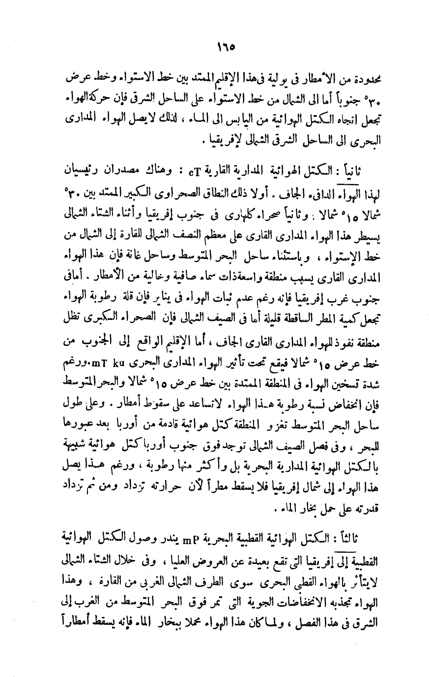 ثانيًا: الكتل الهوائية المدارية القارية C T: وهناك مصدران رئيسيان لهذا الهواء الدافئ الجاف. أولًا ذلك النطاق الصحراوي الكبير الممتد بين 30 ْشمالًا, 15 ْشمالًا: وثانيًا صحراء كلهاري في جنوب إفريقيا وأثناء الشتاء الشمالي يسيطر هذا الهواء المداري القاري على معظم النصف الشمالي للقارة إلى الشمال من خط الاستواء، وباستثناء ساحل البحر المتوسط وساحل غانة، فإن هذا الهواء المداري القاري يسبب منطقة واسعة ذات سماء صافية وخالية من الأمطار، أما في جنوب غرب إفريقيا فإنه رغم عدم ثبات الهواء في يناير فإن قلة رطوبة الهواء تجعل كمية المطر الساقطة قليلة أما في الصيف الشمالي فإن الصحراء الكبرى تظل منطقة نفوذ للهواء المداري القاري الجاف، أما الإقليم الواقع إلى الجنوب من خط عرض 15 ْشمالًا فيقع تحت تأثير الهواء المداري البحري mt ku, ورغم شدة تسخين الهواء في المنطقة الممتدة بين خط عرض 15 ْشمالًا والبحر المتوسط فإن انخفاض نسبة رطوبة هذا الهواء لا تساعد على سقوط أمطار. وعلى طول ساحل البحر المتوسط تغزو المنطقة كتل هوائية قادمة من أوربا بعد عبورها للبحر، وفي فصل الصيف الشمالي توجد فوق جنوب أوربا كتل هوائية شبيهة بالكتل الهوائية المدارية البحرية بل وأكثر منها رطوبة، ورغم هذا يصل هذا الهواء إلى شمال إفريقيا فلا يسقط مطرًا لأن حرارته تزداد ومن ثم تزداد قدرته على حمل بخار الماء.