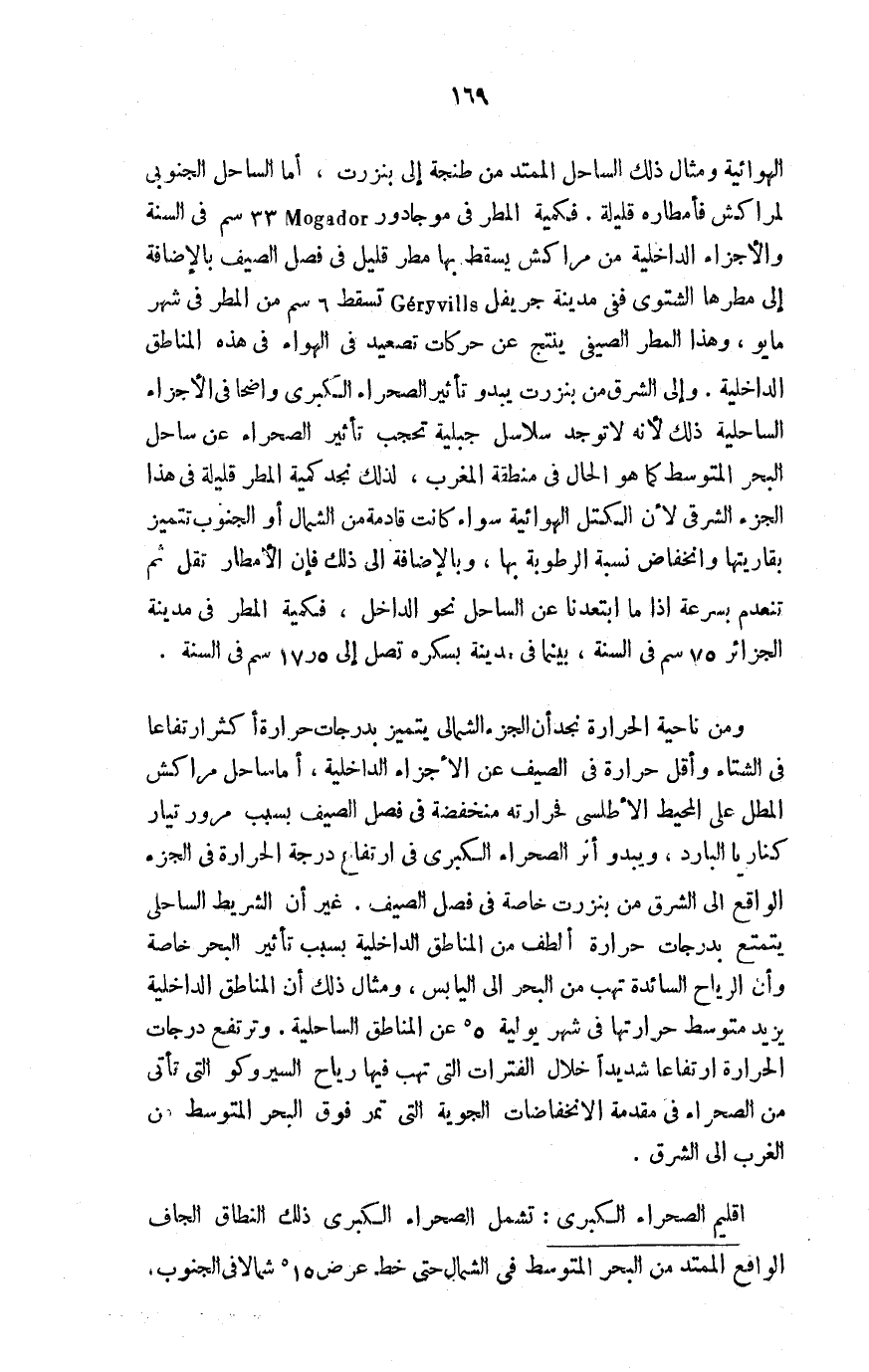 الهوائية ومثال ذلك الساحل الممتد من طنجة إلى بنزرت، أما الساحل الجنوبي لمراكش فأمطاره قليلة، فكمية المطر في موجادور 33mogador سم في السنة والأجزاء الداخلية من مراكش يسقط بها مطر قليل في فصل الصيف بالإضافة إلى مطرها الشتوي ففي مدينة جريفل Geryvills تسقط 6 سم من المطر في شهر مايو، وهذا المطر الصيفي ينتج عن حركات تصعيد في الهواء في هذه المناطق الداخلية. وإلى الشرق من بنزرت يبدو تأثير الصحراء الكبرى واضحًا في الأجزاء الساحلية ذلك لأنه لا توجد سلاسل جبلية تحجب تأثير الصحراء عن ساحل البحر المتوسط كما هو الحال في منطقة المغرب، لذلك نجد كمية المطر قليلة في هذا الجزء الشرقي لأن الكتل الهوائية سواء كانت قادمة من الشمال أو الجنوب تتميز بقاريتها وانخفاض نسبة الرطوبة بها، وبالإضافة إلى ذلك فإن الأمطار تقل ثم تنعدم بسرعة إذا ما ابتعدنا عن الساحل نحو الداخل، فكمية المطر في مدينة الجزائر 75 سم في السنة، بينما في مدينة بسكره تصل إلى 17.5 سم في السنة.