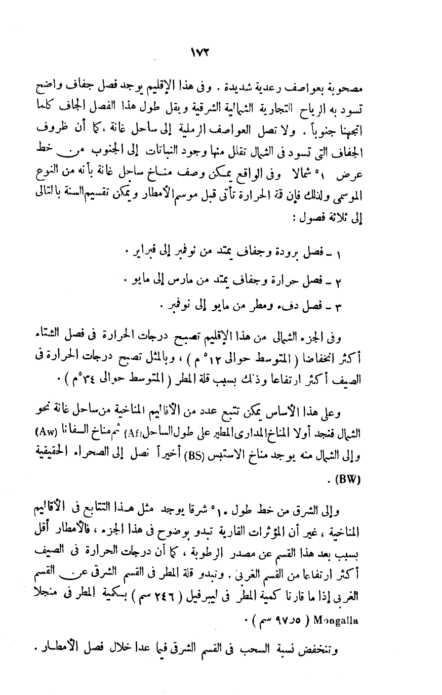مصحوبة بعواصف رعدية شديدة. وفي هذا الإقليم يوجد فصل جفاف واضح تسود به الرياح التجارية الشمالية الشرقية ويقل طول هذا الفصل الجاف كلما اتجهنا جنوبًا. ولا تصل العواصف الرملية إلى ساحل غانة، كما أن ظروف الجفاف التي تسود في الشمال تقلل منها وجود النباتات إلى الجنوب من خط عرض 1 ْشمالًا وفي الواقع يمكن وصف مناخ ساحل غانة بأنه من النوع الموسمي ولذلك فإن قمة الحرارة تأتي قبل موسم الأمطار ويمكن تقسيم السنة بالتالي إلى ثلاثة فصول: