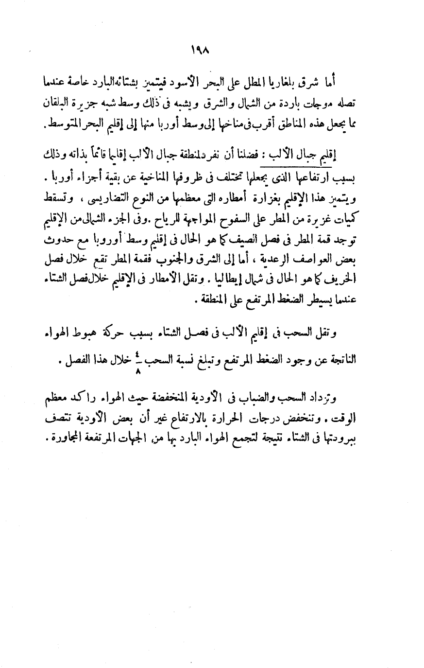 فضلنا أن نفرد لمنطقة جبال الألب إقليمًا قائمًا بذاته وذلك بسبب ارتفاعها الذي يجعلها تختلف في ظروفها المناخية عن بقية أجزاء أوربا. ويتميز هذا الإقليم بغزارة أمطاره التي معظمها من النوع التضاريسي، وتسقط كميات غزيرة من المطر على السفوح المواجهة للرياح. وفي الجزء الشمالي من الإقليم توجد قمة المطر في فصل الصيف كما هو الحال في إقليم وسط أوروبا مع حدوث بعض العواصف الرعدية، أما إلى الشرق والجنوب فقمة المطر تقع خلال فصل الخريف كما هو الحال في شمال إيطاليا، وتقل الأمطار في الإقليم خلال فصل الشتاء عندما يسيطر الضغط المرتفع على المنطقة.