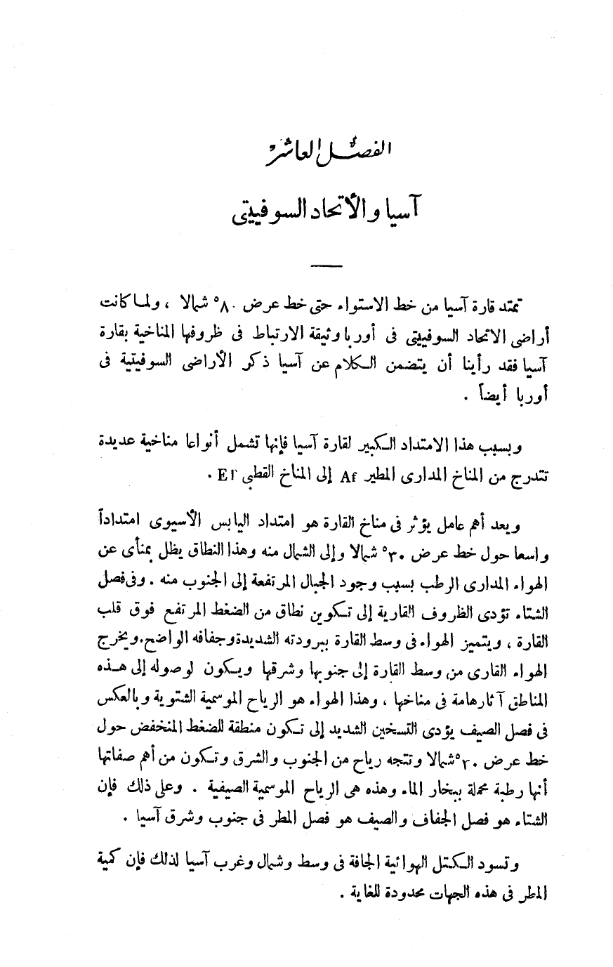 تمتد قارة آسيا من خط الاستواء حتى خط عرض 80 ْشمالًا، ولما كانت أراضي الاتحاد السوفيتي في أوربا وثيقة الارتباط في ظروفها المناخية بقارة آسيا فقد رأينا أن يتضمن الكلام عن آسيا ذكر الأراضي السوفيتية في أوربا أيضًا.