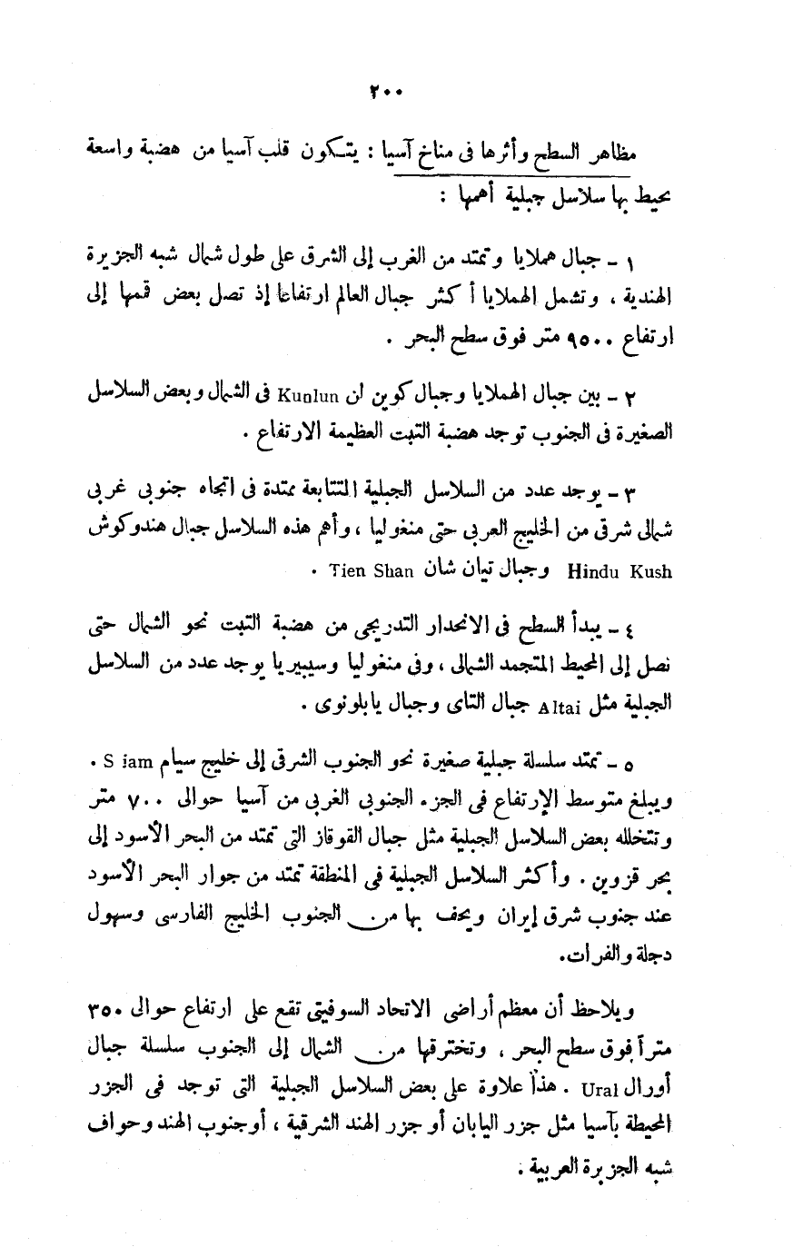 3- يوجد عدد من السلاسل الجبلية المتتابعة ممتدة في اتجاه جنوبي غربي شمالي شرقي من الخليج العربي حتى منغوليا، وأهم هذه السلاسل جبال هندوكوش Hindu Kush وجبال تيان شان Tien Shan.