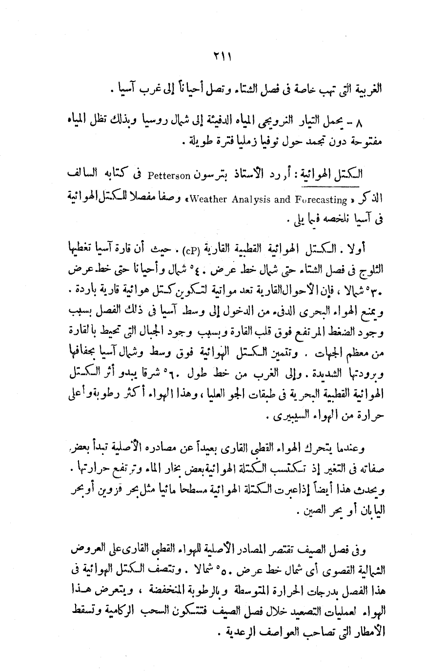 أورد الأستاذ بترسون petterson في كتابه السالف الذكر "Weather Analysis and Forecasting" وصفًا مفصلًا للكتل الهوائية في آسيا نلخصه فيما يلي: