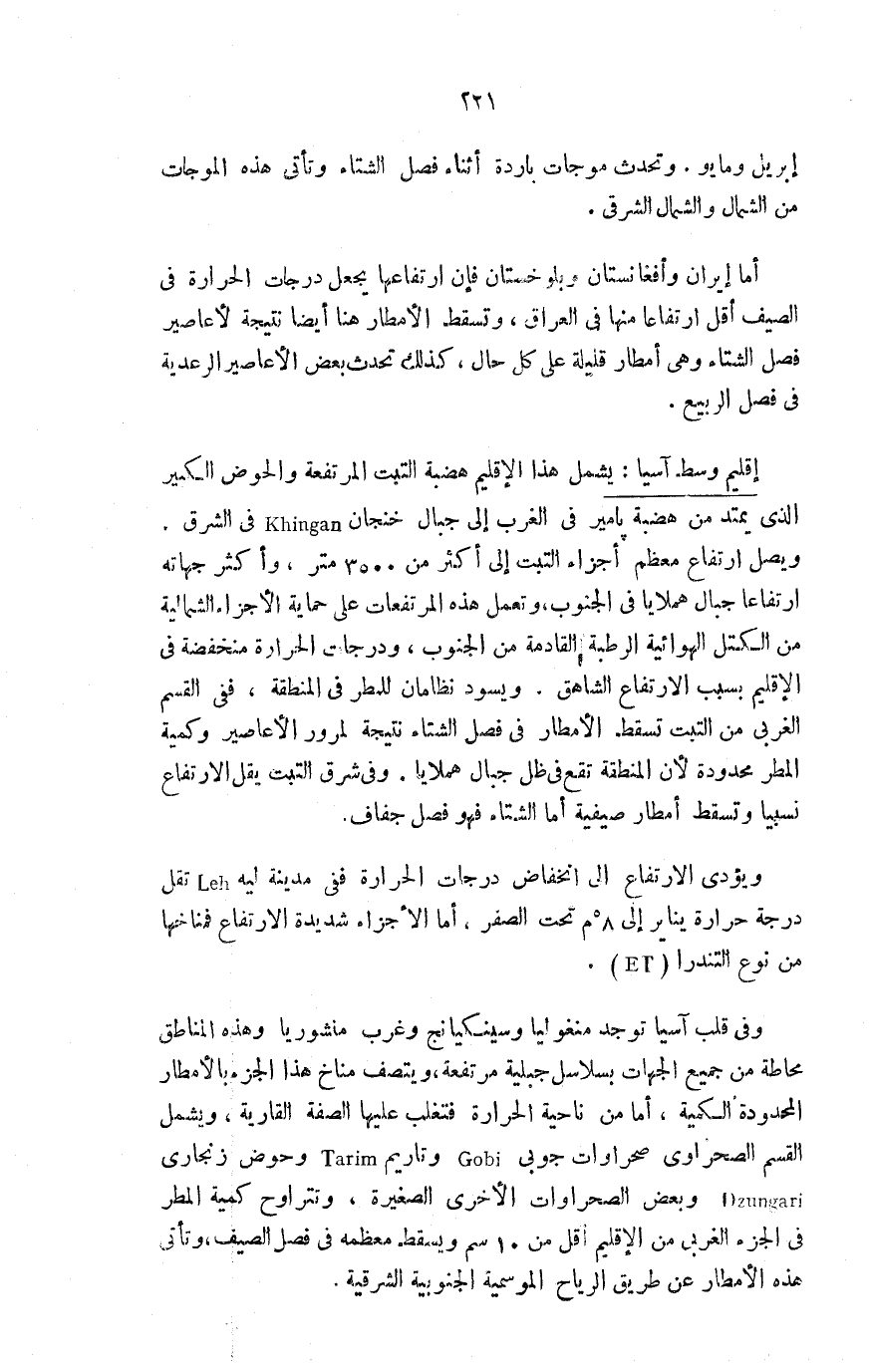 وفي قلب آسيا توجد منغوليا وسينكيانج وغرب منشوريا وهذه المناطق محاطة من جميع الجهات بسلاسل جبلية مرتفعة، ويتصف مناخ هذا الجزء بالأمطار المحدودة الكمية، أما من ناحية الحرارة فتغلب عليها الصفة القارية، ويشمل القسم الصحراوي صحراوات جوبي Gobi وتاريم Tarim وحوض زنجاري Dzungari وبعض الصحراوات الأخرى الصغيرة، وتتراوح كمية المطر في الجزء الغربي من الإقليم أقل من 10سم ويسقط معظمه في فصل الصيف، وتأتي هذه الأمطار عن طريق الرياح الموسمية الجنوبية الشرقية.