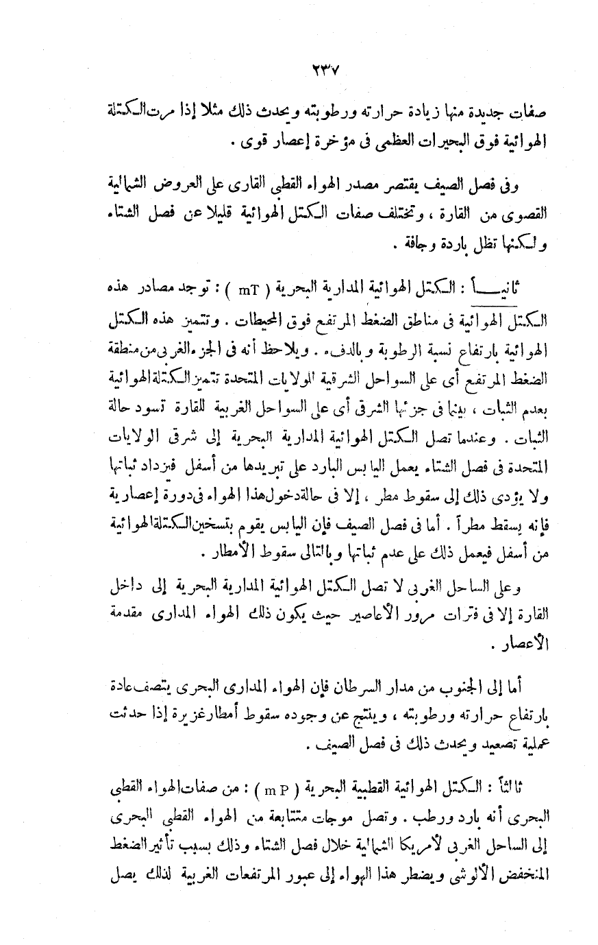 ثانيًا: الكتل الهوائية المدارية البحرية "mT": توجد مصادر هذه الكتل الهوائية في مناطق الضغط المرتفع فوق المحيطات، وتتميز هذه الكتل الهوائية بارتفاع نسبة الرطوبة وبالدفء. ويلاحظ أنه في الجزء الغربي من منطقة الضغط المرتفع أي على السواحل الشرقية للولايات المتحدة تتميز الكتلة الهوائية بعدم الثبات، بينما في جزئها الشرقي أي على السواحل الغربية للقارة تسود حالة الثبات. وعندما تصل الكتل الهوائية المدارية البحرية إلى شرقي الولايات المتحدة في فصل الشتاء يعمل اليابس البارد على تبريدها من أسفل فيزداد ثباتها ولا يؤدي ذلك إلى سقوط مطر، إلا في حالة دخول هذا الهواء في دورة إعصارية فإنه يسقط مطرًا. أما في فصل الصيف فإن اليابس يقوم بتسخين الكتلة الهوائية من أسفل فيعمل ذلك على عدم ثباتها وبالتالي سقوط الأمطار.