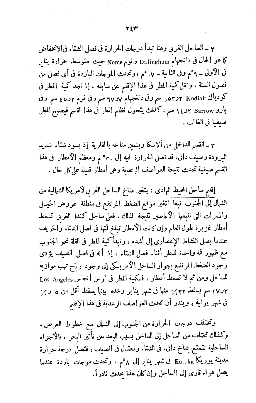 2- الساحل الغربي وهنا تبدأ درجات الحرارة في فصل الشتاء في الانخفاض كما هو الحال في دلنجهام Dillingham ونوم Nome حيث متوسط حرارة يناير في الأولى - 9 ْم وفي الثانية - 7 ْم، وتحدث الموجات الباردة في أي فصل من فصول السنة، وتقل كمية المطر في هذا الإقليم عن سابقه، إذ نجد كمية المطر في كودياك 53.2kodiak سم وفي دلنجهام 67.7 سم، وفي نوم 45.2 سم وفي بارو 14.2Barrow سم، كذلك يتحول نظام المطر في هذا القسم فيصبح المطر صيفيًّا في الغالب.