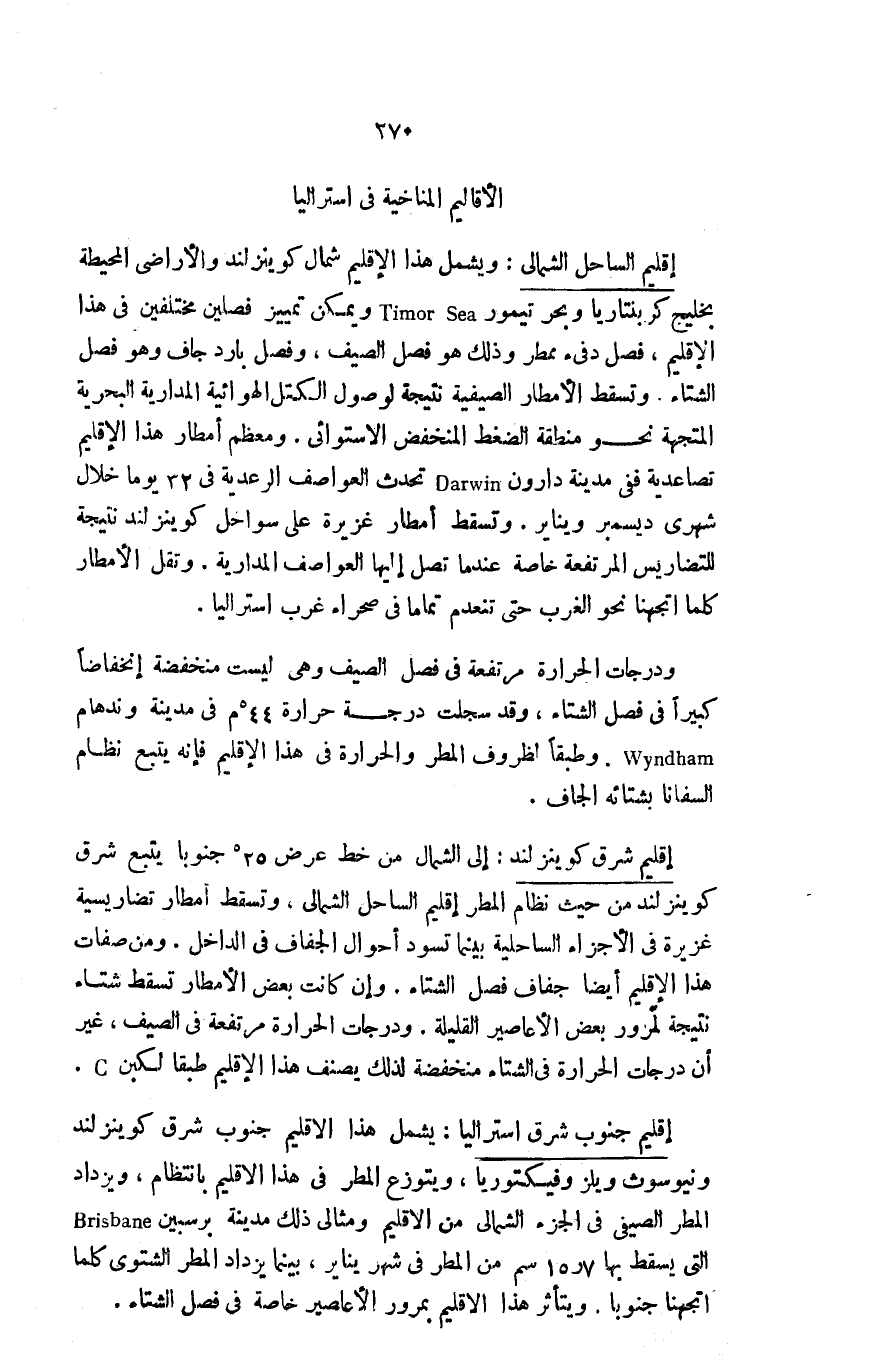 إقليم الساحل الشمالي: ويشمل هذا الإقليم شمال كوينزلند والأراضي المحيطة بخليج كربنتاريا وبحر تيمور Timor Sea ويمكن تمييز فصلين مختلفين في هذا الإقليم، فصل دافئ ممطر وذلك هو فصل الصيف، وفصل بارد جاف وهو فصل الشتاء. وتسقط الأمطار الصيفية نتيجة لوصول الكتل الهوائية المدارية البحرية المتجهة نحو منطقة الضغط المنخفض الاستوائي. ومعظم أمطار هذا الإقليم تصاعدية ففي مدينة دارون Darwin تحدث العواصف الرعدية في 32 يومًا خلال شهري ديسمبر ويناير. وتسقط أمطار غزيرة على سواحل كوينزلند نتيجة للتضاريس المرتفعة خاصة عندما تصل إليها العواصف المدارية. وتقل الأمطار كلما اتجهنا نحو الغرب حتى تنعدم تمامًا في صحراء غرب استراليا.