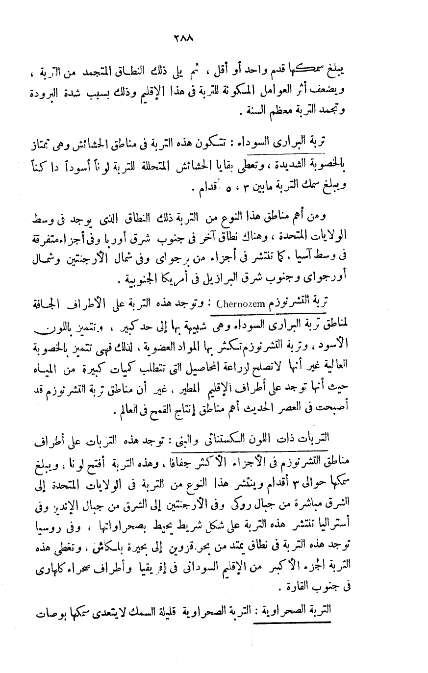تربة التشرنوزمChernozem: وتوجد هذه التربة على الأطراف الجافة لمناطق تربة البراري السوداء وهي شبيهة بها إلى حد كبير، وتتميز باللون الأسود، وتربة التشرنوزم تكثر بها المواد العضوية، لذلك فهي تتميز بالخصوبة العالية غير أنها لا تصلح لزراعة المحاصيل التي تتطلب كميات كبيرة من المياه، حيث إنها توجد على أطراف الإقليم المطير، غير أن مناطق تربة التشرنوزم قد أصبحت في العصر الحديث أهم مناطق إنتاج القمح في العالم.