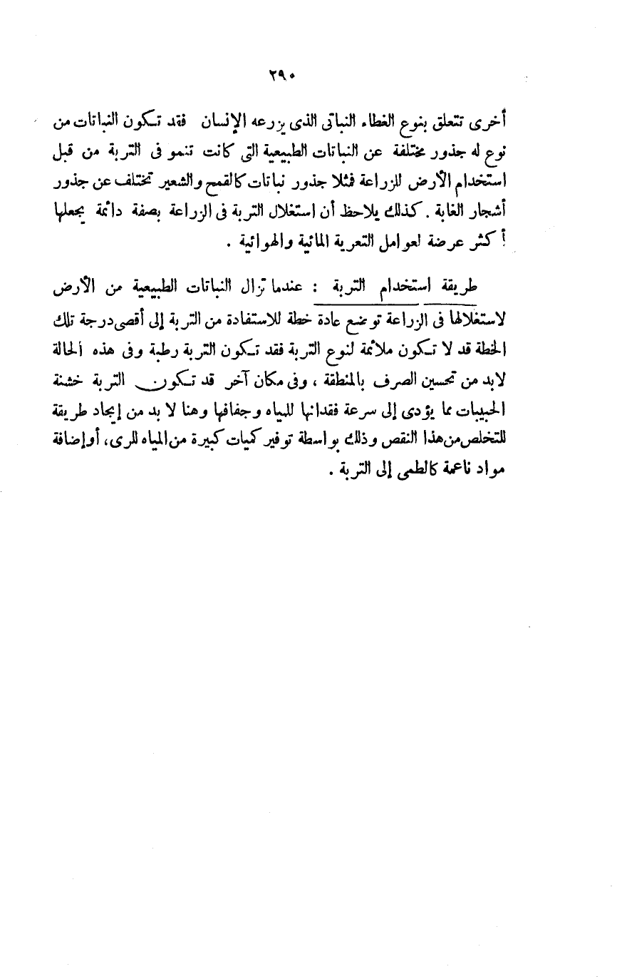 طريقة استخدام التربة: عندما تزال النباتات الطبيعية من الأرض لاستغلالها في الزراعة توضع عادة خطة للاستفادة من التربة إلى أقصى درجة تلك الخطة قد لا تكون ملائمة لنوع التربة، فقد تكون التربة رطبة وفي هذه الحالة لا بد من تحسين الصرف بالمنطقة، وفي مكان آخر قد تكون التربة خشنة الحبيبات مما يؤدي إلى سرعة فقدانها للمياه وجفافها، وهنا لا بد من إيجاد طريقة للتخلص من هذا النقص، وذلك بواسطة توفير كميات كبيرة من المياه للري، أو إضافة مواد ناعمة كالطمي إلى التربة.