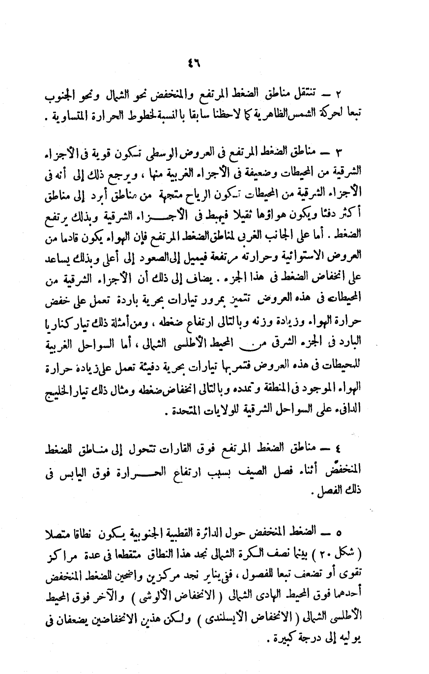 5- الضغط المنخفض حول الدائرة القطبية الجنوبية يكون نطاقًا متصلًا "شكل 20" بينما نصف الكرة الشمالي نجد هذا النطاق متقطعًا في عدة مراكز تقوي أو تضعف تبعًا للفصول، ففي يناير نجد مركزين واضحين للضغط المنخفض: أحدهما فوق المحيط الهادي الشمالي "الانخفاض الألوشي" والآخر فوق المحيط الأطلسي الشمالي "الانخفاض الأيسلندي" ولكن هذين الانخفاضين يضعفان في يوليه إلى درجة كبيرة.