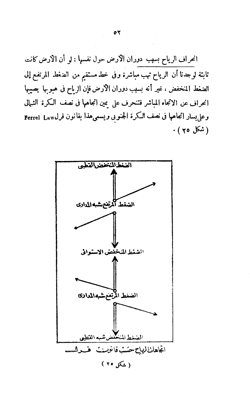 انحراف الرياح بسبب دوران الأرض حول نفسها: لو أن الأرض كانت ثابتة لوجدنا أن الرياح تهب مباشرة وفي خط مستقيم من الضغط المرتفع إلى الضغط المنخفض، غير أنه بسبب دوران الأرض فإن الرياح في هبوبها يصيبها انحراف عن الاتجاه المباشر فتنحرف على يمين اتجاهها في نصف الكرة الشمالي وعلى يسار اتجاهها في نصف الكرة الجنوبي، ويسمى هذا بقانون فرل Ferrl Law "شكل 25".