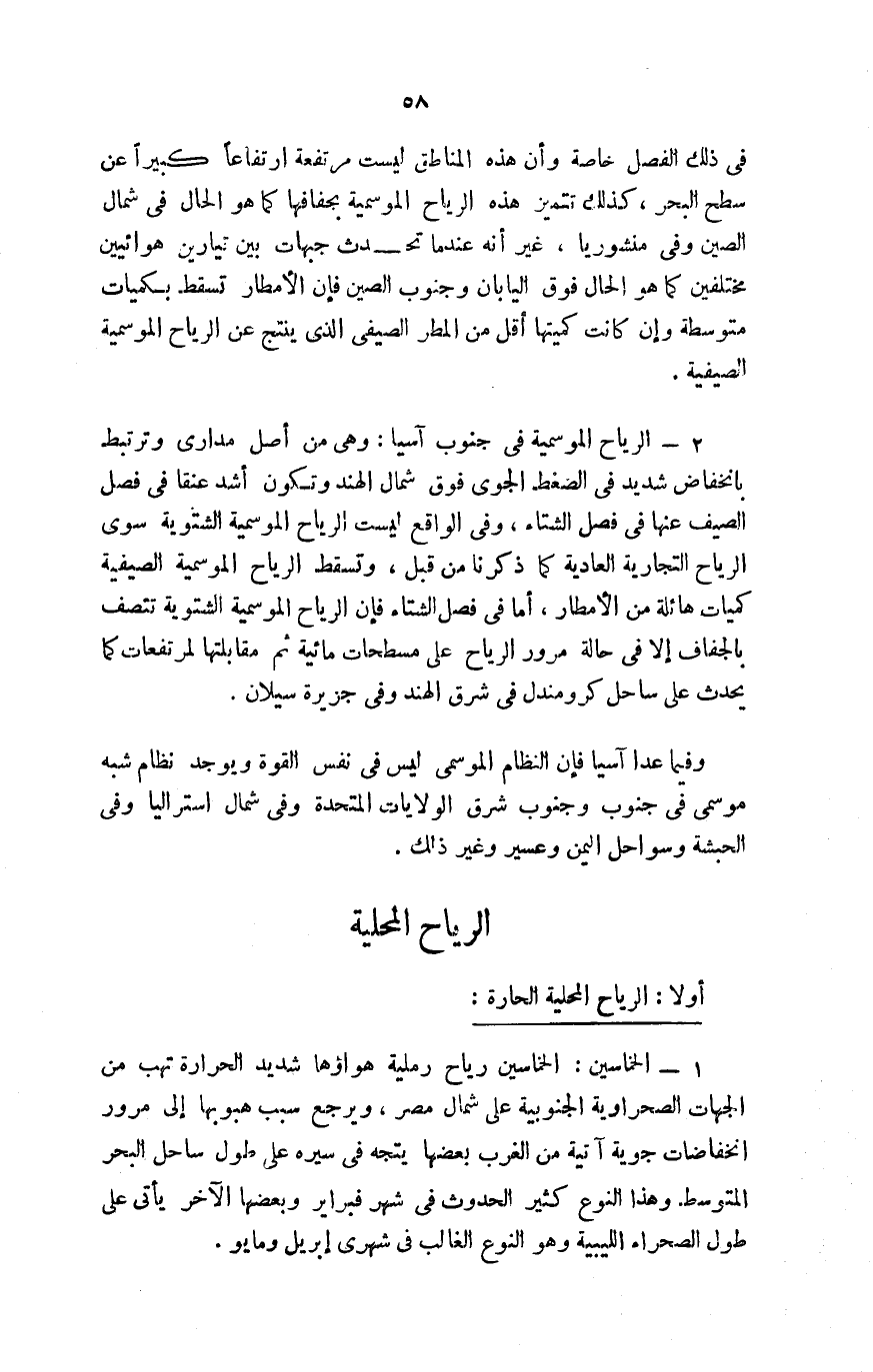 2- الرياح الموسمية في جنوب آسيا: وهي من أصل مداري وترتبط بانخفاض شديد في الضغط الجوي فوق شمال الهند وتكون أشد عنفًا في فصل الصيف عنها في فصل الشتاء، وفي الواقع ليست الرياح الموسمية الشتوية سوى الرياح التجارية العادية كما ذكرنا من قبل، وتسقط الرياح الموسمية الصيفية كميات هائلة من الأمطار، أما في فصل الشتاء فإن الرياح الموسمية الشتوية تتصف بالجفاف إلا في حالة مرور الرياح على مسطحات مائية ثم مقابلتها لمرتفعات كما يحدث على ساحل كرومندل في شرق الهند وفي جزيرة سيلان.