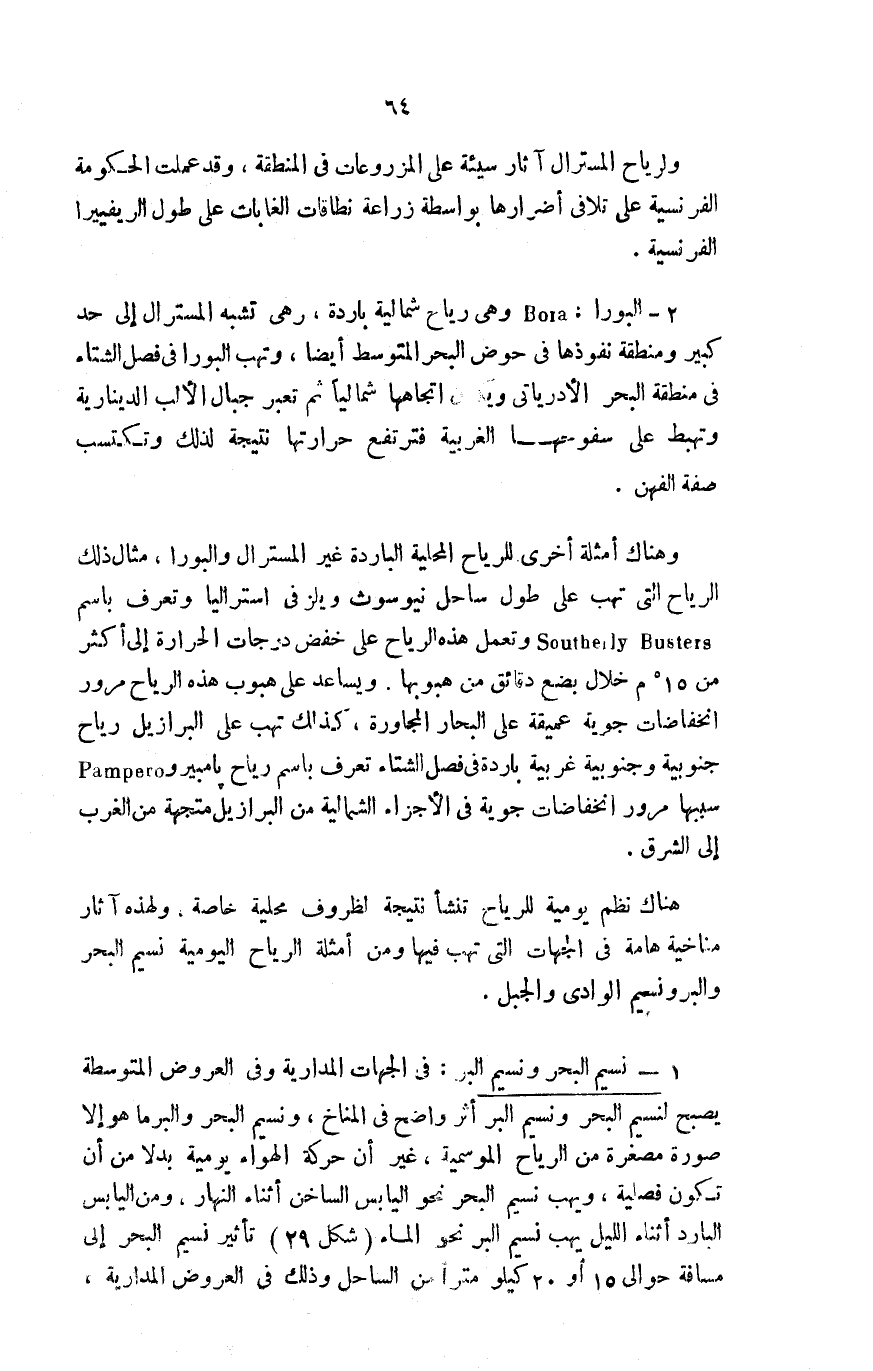 1- نسيم البحر ونسيم البر: في الجهات المدارية وفي العروض المتوسطة يصبح لنسيم البحر ونسيم البر أثر واضح في المناخ، ونسيم البحر والبر ما هو إلا صورة مصغرة من الرياح الموسمية، غير أن حركة الهواء يومية بدلًا من أن تكون فصلية، ويهب نسيم البحر نحو اليابس الساخن أثناء النهار، ومن اليابس البارد أثناء الليل يهب نسيم البر نحو الماء "شكل 29" تأثير نسيم البحر إلى مسافة حوالي 15 أو 20 كيلو مترًا من الساحل وذلك في العروض المدارية،