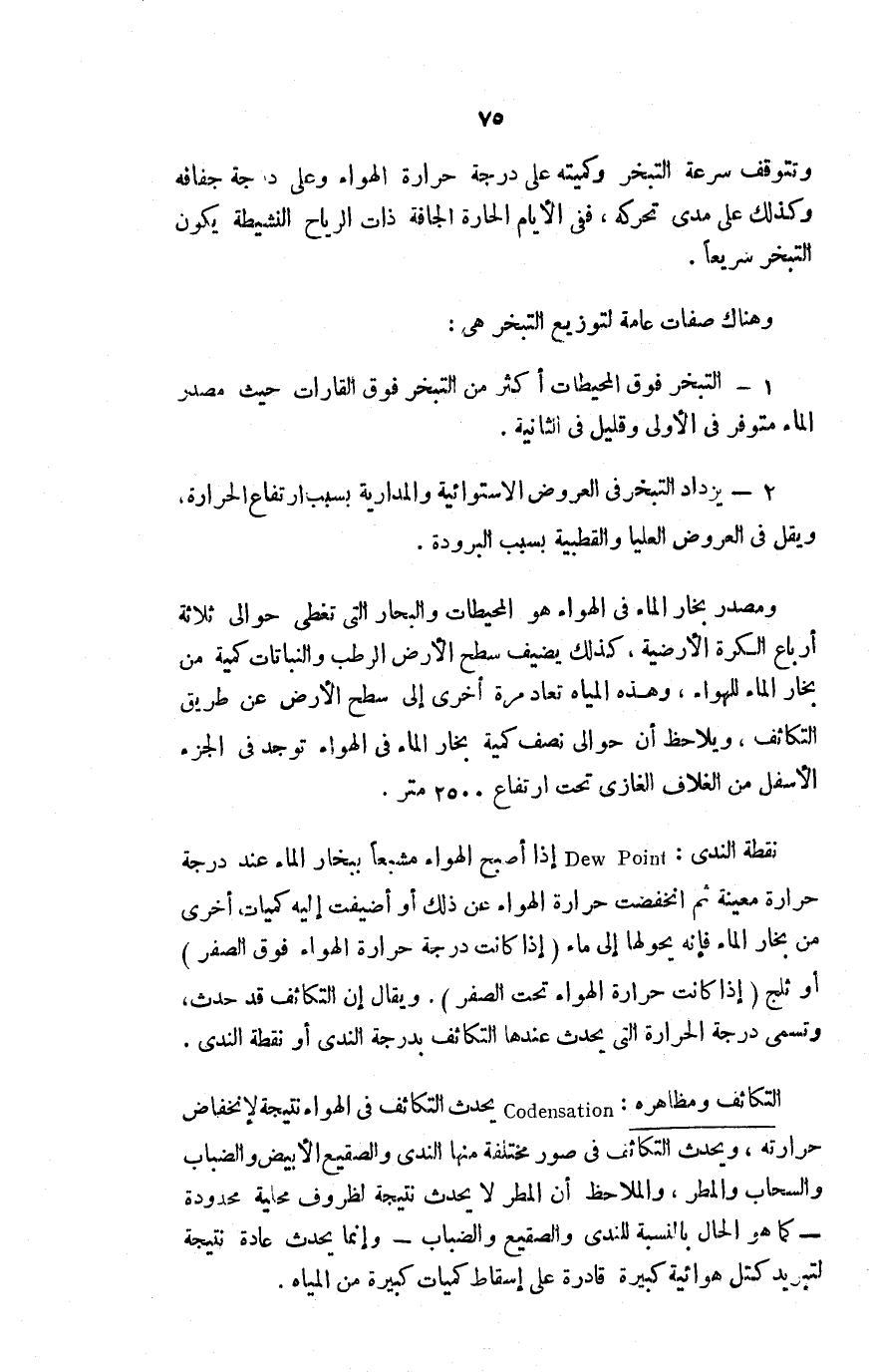 التكاثف ومظاهره Codensation يحدث التكاثف في الهواء نتيجة لانخفاض حرارته، ويحدث التكاثف في صور مختلفة منها الندى والصقيع الأبيض والضباب والسحاب والمطر، والملاحظ أن المطر لا يحدث نتيجة لظروف محلية محدودة -كما هو الحال بالنسبة للندى والصقيع والضباب- وإنما يحدث عادة نتيجة لتبريد كتل هوائية كبيرة قادرة على إسقاط كميات كبيرة من المياه.