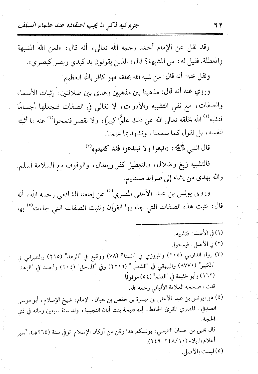 قال النبي صلى الله عليه وسلم:" اتبعوا ولا تبتدعوا فقد كفيتم "3 فالتشبيه زيغ وضلال، والتعطيل كفر وإبطال، والوقوف مع السلامة أسلم.