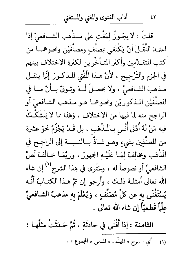 قلتُ لَا يجوز لمفتٍ على مَذْهَب الشَّافِعِي إِذا اعْتمد النَّقْل أَن يَكْتَفِي بمصنَّفٍ ومصنفين وَنَحْوهمَا من كتب الْمُتَقَدِّمين وَأكْثر الْمُتَأَخِّرين لِكَثْرَة الِاخْتِلَاف بَينهم فِي الْجَزْم وَالتَّرْجِيح لِأَن هَذَا الْمُفْتِي الْمَذْكُور إِنَّمَا ينْقل مَذْهَب الشَّافِعِي وَلَا يحصل لَهُ وثوق بِأَن مَا فِي المصنفين الْمَذْكُورين وَنَحْوهمَا هُوَ مَذْهَب الشَّافِعِي أَو الرَّاجِح مِنْهُ لما فِيهَا من الِاخْتِلَاف وَهَذَا مِمَّا لَا يتشكك فِيهِ من لَهُ أدنى أنس بِالْمذهبِ بل قد يجْزم نَحْو عشرَة من المصنفين بِشَيْء وَهُوَ شاذٌ بِالنِّسْبَةِ إِلَى الرَّاجِح فِي الْمَذْهَب ومخالفٌ لما عَلَيْهِ الْجُمْهُور وَرُبمَا خَالف نصَّ الشَّافِعِي أَو نصوصاً لَهُ وسترى فِي هَذَا الشَّرْح إِن شَاءَ الله تَعَالَى أَمْثِلَة ذَلِك وَأَرْجُو إِن تمّ هَذَا الْكتاب أَنه يسْتَغْنى بِهِ عَن كل مصنّف وَيعلم بِهِ مَذْهَب الشَّافِعِي علما قَطْعِيا إِن شَاءَ الله تَعَالَى