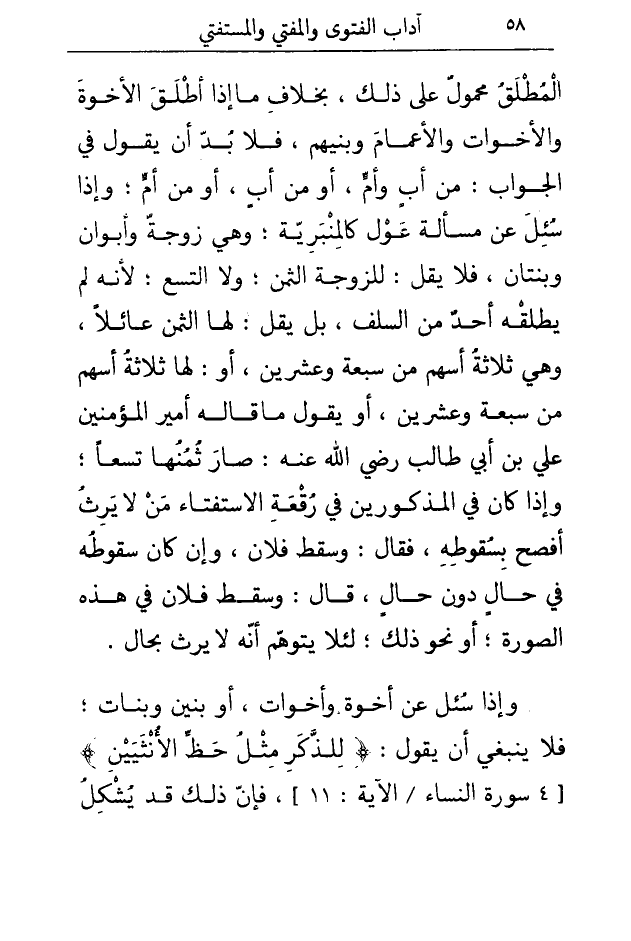 الْمُطلق مَحْمُول على ذَلِك بِخِلَاف مَا أطلق الْإِخْوَة وَالْأَخَوَات والأعمام وَبينهمْ فَلَا بُد أَن يَقُول فِي الْجَواب من أَب وَأم أَو من أَب أَو من أم وَإِذا سُئِلَ عَن مَسْأَلَة عول كالمنبرية وَهِي زَوْجَة وأبوان وبنتان فَلَا يقل للزَّوْجَة الثّمن وَلَا التسع لِأَنَّهُ لم يُطلقهُ أحدٌ من السّلف بل يقل لَهَا الثّمن عائلاً وَهِي ثَلَاثَة أسْهم من سَبْعَة وَعشْرين أَو لَهَا ثَلَاثَة أسْهم من سَبْعَة وَعشْرين أَو يَقُول مَا قَالَه أَمِير الْمُؤمنِينَ عَليّ بن أبي طَالب رَضِي الله عَنهُ صَار ثمنهَا تسعا وَإِذا كَانَ فِي الْمَذْكُورين فِي رقْعَة الاستفتاء مَنْ لَا يَرث أفْصح بسقوطه فَقَالَ وَسقط فلَان وَإِن كَانَ سُقُوطه فِي حَال دون حَال قَالَ وَسقط فلَان فِي هَذِه الصُّورَة أَو نَحْو ذَلِك لِئَلَّا يتَوَهَّم أَنه لَا يَرث بِحَال