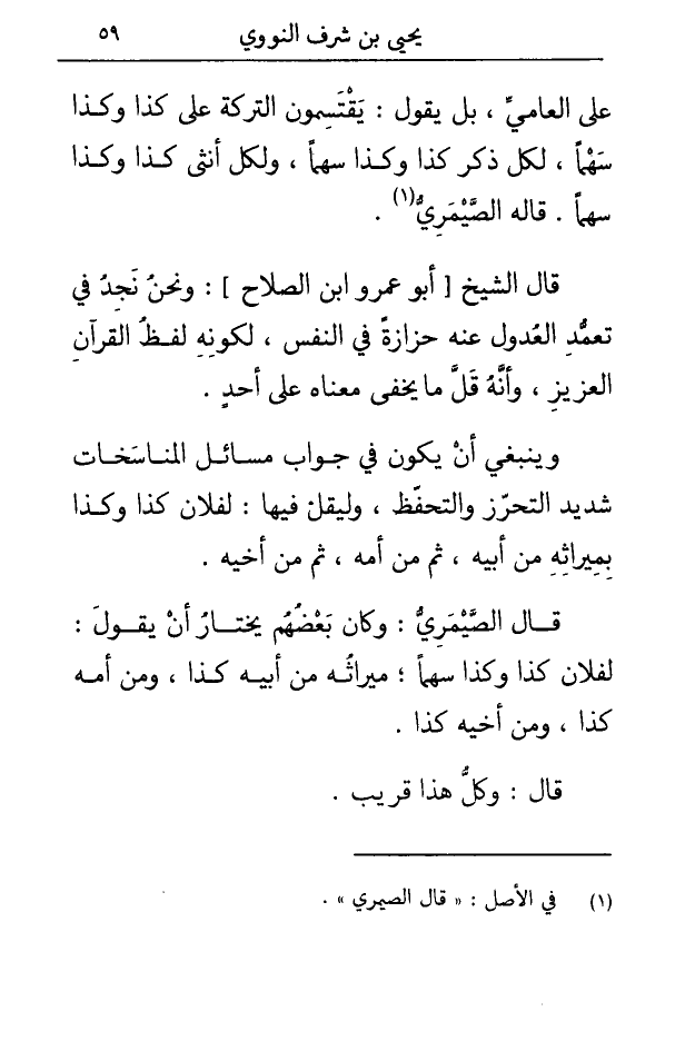 قَالَ الصَّيْمَرِيّ وَكَانَ بَعضهم يخْتَار أَن يَقُول لفُلَان كَذَا وَكَذَا سَهْما مِيرَاثه من أَبِيه كَذَا وَمن أمه كَذَا وَمن أَخِيه كَذَا