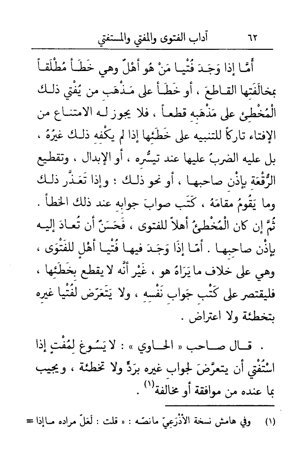 أما إِذا وجد فتيا من هُوَ أهل وَهِي خطأ مُطلقًا بمخالفتها الْقَاطِع أَو خطأ على مَذْهَب من يُفْتِي ذَلِك الْمُخطئ على مذْهبه قطعا فَلَا يجوز لَهُ الِامْتِنَاع من الْإِفْتَاء تَارِكًا للتّنْبِيه على خطئها إِذا لم يكفه ذَلِك غَيره بل عَلَيْهِ الضَّرْب عَلَيْهَا عِنْد تيسره أَو الْإِبْدَال وتقطيع الرقعة بِإِذن صَاحبهَا أَو نَحْو ذَلِك وَإِذا تعذر ذَلِك وَمَا يقوم مقَامه كتب صَوَاب جَوَابه عِنْد ذَلِك الْخَطَأ ثمَّ إِن كَانَ الْمُخطئ أَهلا للْفَتْوَى فَحسن أَن تُعَاد إِلَيْهِ بِإِذن صَاحبهَا أما إِذا وجد فِيهَا فتيا أهل للْفَتْوَى وَهِي على خلاف مَا يرَاهُ هُوَ غير أَنه لَا يقطع بخطئها فليقتصر على كتب جَوَاب نَفسه وَلَا يتَعَرَّض لفتيا غَيره بتخطئة وَلَا اعْتِرَاض