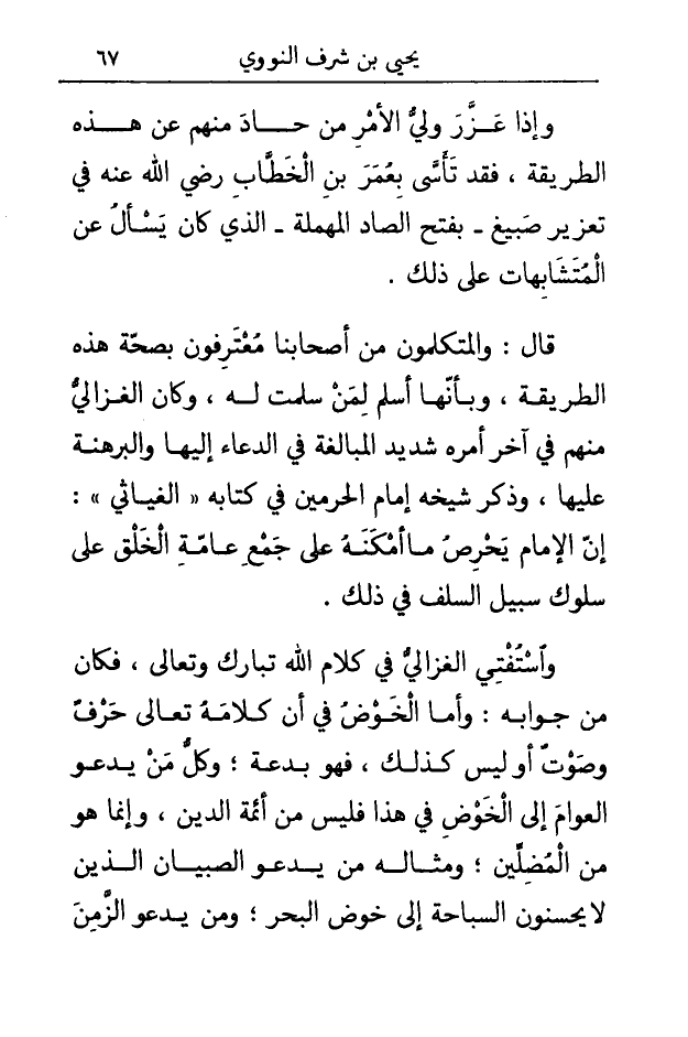 قَالَ والمتكلمون من أَصْحَابنَا معترفون بِصِحَّة هَذِه الطَّرِيقَة وبأنها أسلم لمن سلمت لَهُ وَكَانَ الْغَزالِيّ مِنْهُم فِي آخر أمره شَدِيد الْمُبَالغَة فِي الدُّعَاء إِلَيْهَا والبرهنة عَلَيْهَا وَذكر شَيْخه إِمَام الْحَرَمَيْنِ فِي كِتَابه الغياثي أَن الإِمَام يحرص مَا أمكنه على جمع عَامَّة الْخلق على سلوك سَبِيل السّلف فِي ذَلِك