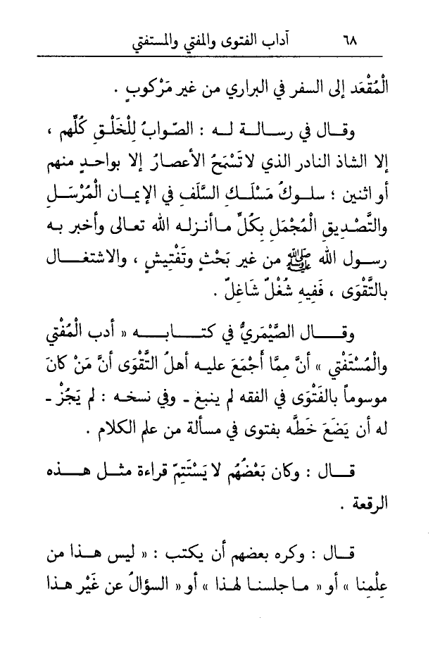 وَقَالَ فِي رِسَالَة لَهُ الصَّوَاب لِلْخلقِ كلهم إِلَّا الشاذ النَّادِر الَّذِي لَا تسمح الْأَعْصَار إِلَّا بِوَاحِد مِنْهُم أَو اثْنَيْنِ سلوك مَسْلَك السّلف فِي الْإِيمَان الْمُرْسل والتصديق الْمُجْمل بِكُل مَا أنزلهُ الله تَعَالَى وَأخْبر بِهِ رَسُول الله صلى الله عَلَيْهِ وَسلم من غير بحث وتفتيش والاشتغال بالتقوى فَفِيهِ شغل شاغل