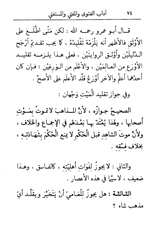 قَالَ أَبُو عَمْرو رَحمَه الله لَكِن مَتى اطلع على الأوثق فَالْأَظْهر أَنه يلْزمه تَقْلِيده كَمَا يجب تَقْدِيم أرجح الدَّلِيلَيْنِ وأوثق الرِّوَايَتَيْنِ فعلى هَذَا يلْزمه تَقْلِيد الأورع من الْعَالمين والأعلم من الورعين فَإِن كَانَ أَحدهمَا أعلم وَالْآخر أورع قلد الأعلم على الْأَصَح