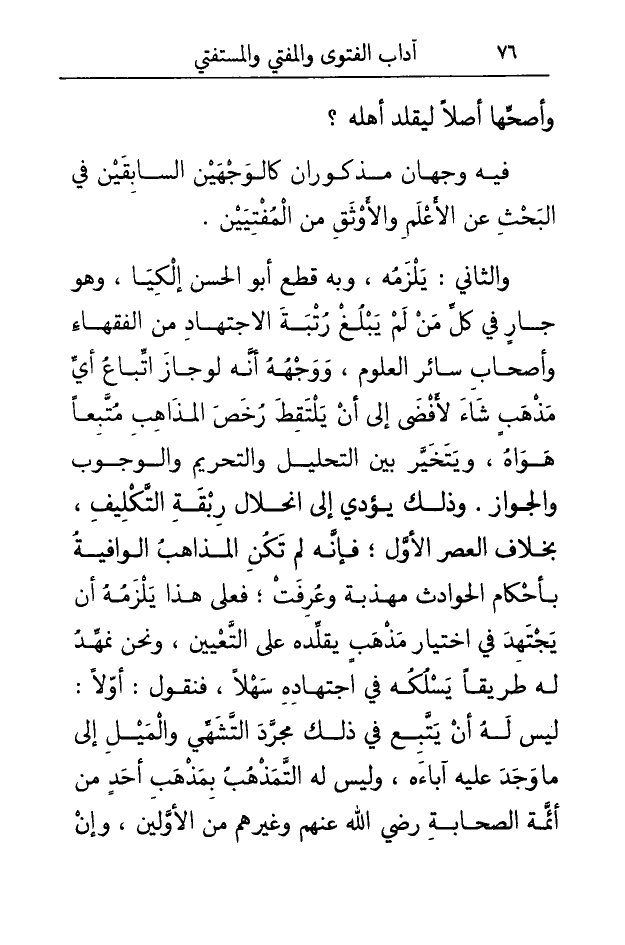وَالثَّانِي يلْزمه وَبِه قطع أَبُو الْحسن إِلْكيَا وَهُوَ جارٍ فِي كل من لم يبلغ رُتْبَة الِاجْتِهَاد من الْفُقَهَاء وَأَصْحَاب سَائِر الْعُلُوم وَوَجهه أَنه لَو جَازَ اتِّبَاع أَي مَذْهَب شَاءَ لأفضى إِلَى أَن يلتقط رخص الْمذَاهب مُتبعا هَوَاهُ وَيتَخَيَّر بَين التَّحْلِيل وَالتَّحْرِيم وَالْوُجُوب وَالْجَوَاز وَذَلِكَ يُؤَدِّي إِلَى انحلال ربقة التَّكْلِيف بِخِلَاف الْعَصْر الأول فَإِنَّهُ لم تكن الْمذَاهب الوافية بِأَحْكَام الْحَوَادِث مهذّبة وَعرفت فعلى هَذَا يلْزمه أَن يجْتَهد فِي اخْتِيَار مَذْهَب يقلده على التَّعْيِين وَنحن نمهد لَهُ طَرِيقا يسلكه فِي اجْتِهَاده سهلاً فَنَقُول أَولا لَيْسَ لَهُ أَن يتبع فِي ذَلِك مُجَرّد التشهي والميل إِلَى مَا وجد عَلَيْهِ آباءه وَلَيْسَ لَهُ التمذهب بِمذهب أحد من أَئِمَّة الصَّحَابَة رَضِي الله عَنْهُم وَغَيرهم من الْأَوَّلين وَإِن