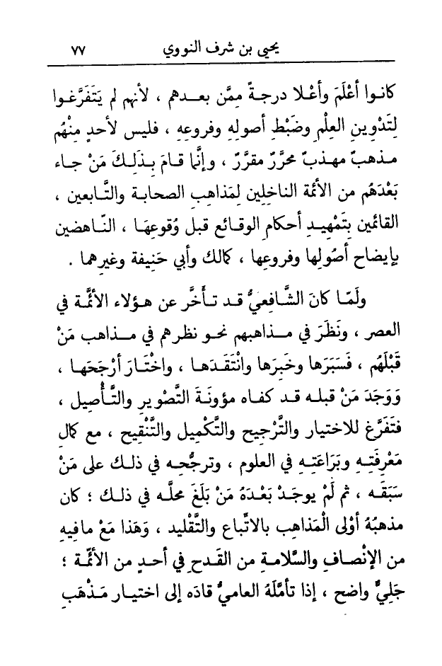 وَلما كَانَ الشَّافِعِي قد تَأَخّر عَن هَؤُلَاءِ الْأَئِمَّة فِي الْعَصْر وَنظر فِي مذاهبهم نَحْو نظرهم فِي مَذَاهِب من قبلهم فسبرها وخبرها وانتقدها وَاخْتَارَ أرجحها وَوجد من قبله قد كَفاهُ مؤونة التَّصْوِير والتأصيل فتفرغ للاختيار وَالتَّرْجِيح والتكميل والتنقيح مَعَ كَمَال مَعْرفَته وبراعته فِي الْعُلُوم وترجحه فِي ذَلِك على من سبقه ثمَّ لم يُوجد بعده من بلغ مَحَله فِي ذَلِك كَانَ مذْهبه أولى الْمذَاهب بالاتباع والتقليد وَهَذَا مَعَ مَا فِيهِ من الْإِنْصَاف والسلامة من الْقدح فِي أحد من الْأَئِمَّة جلي وَاضح إِذا تَأمله الْعَاميّ قَادَهُ إِلَى اخْتِيَار مَذْهَب