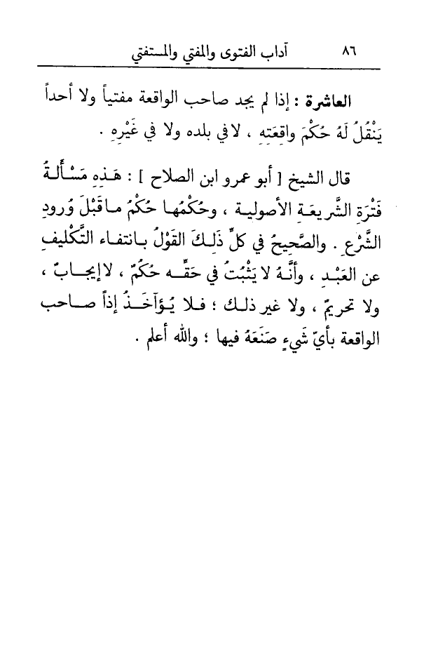 قَالَ الشَّيْخ أَبُو عَمْرو ابْن الصّلاح هَذِه مسألةُ فَترة الشَّرِيعَة الْأُصُولِيَّة وَحكمهَا حكم مَا قبل وُرُود الشَّرْع وَالصَّحِيح فِي كل ذَلِك القَوْل بِانْتِفَاء التَّكْلِيف عَن العَبْد وَأَنه لَا يثبت فِي حَقه حكم لَا إِيجَاب وَلَا تَحْرِيم وَلَا غير ذَلِك فَلَا يؤآخذ إِذا صَاحب الْوَاقِعَة بِأَيّ شَيْء صنعه فِيهَا وَالله أعلم