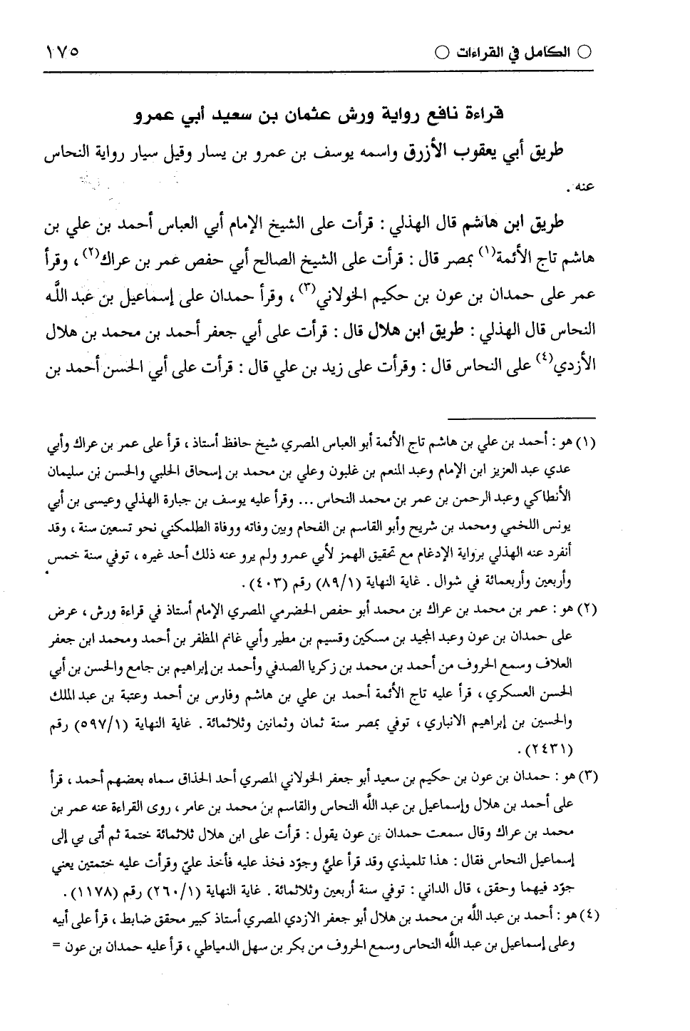 طريق ابن هاشم قال الْهُذَلِيّ: قرأت على الشيخ الإمام أبي العباس أحمد بن علي بن هاشم تاج الأئمة بمصر قال: قرأت على الشيخ الصالح أبي حفص عمر بن عراك، وقرأ عمر على حمدان بن عون بن حكيم الخولاني، وقرأ حمدان على إسماعيل بن عبد اللَّه النحاس قال الْهُذَلِيّ: طريق ابن هلال قال: قرأت على أبي جعفر أحمد بن محمد بن هلال الأزدي على النحاس قال: وقرأت على زيد بن علي قال: قرأت على أبي الحسن أحمد بن
