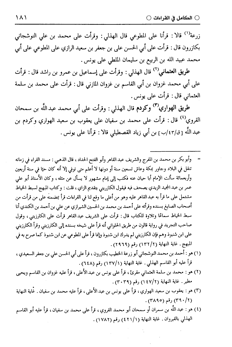 زرعة قالا: قرأنا على الْمُطَّوِّعِيّ قال الْهُذَلِيّ: وقرأت على محمد بن علي النوشجاني بكازرون قال: قرأت على أبي الحسن على بن جعفر بن سعيد الرَّازِيّ على الْمُطَّوِّعِيّ على أبي محمد عبيد الله بن الربيع بن سليمان الملطي على يونس.
