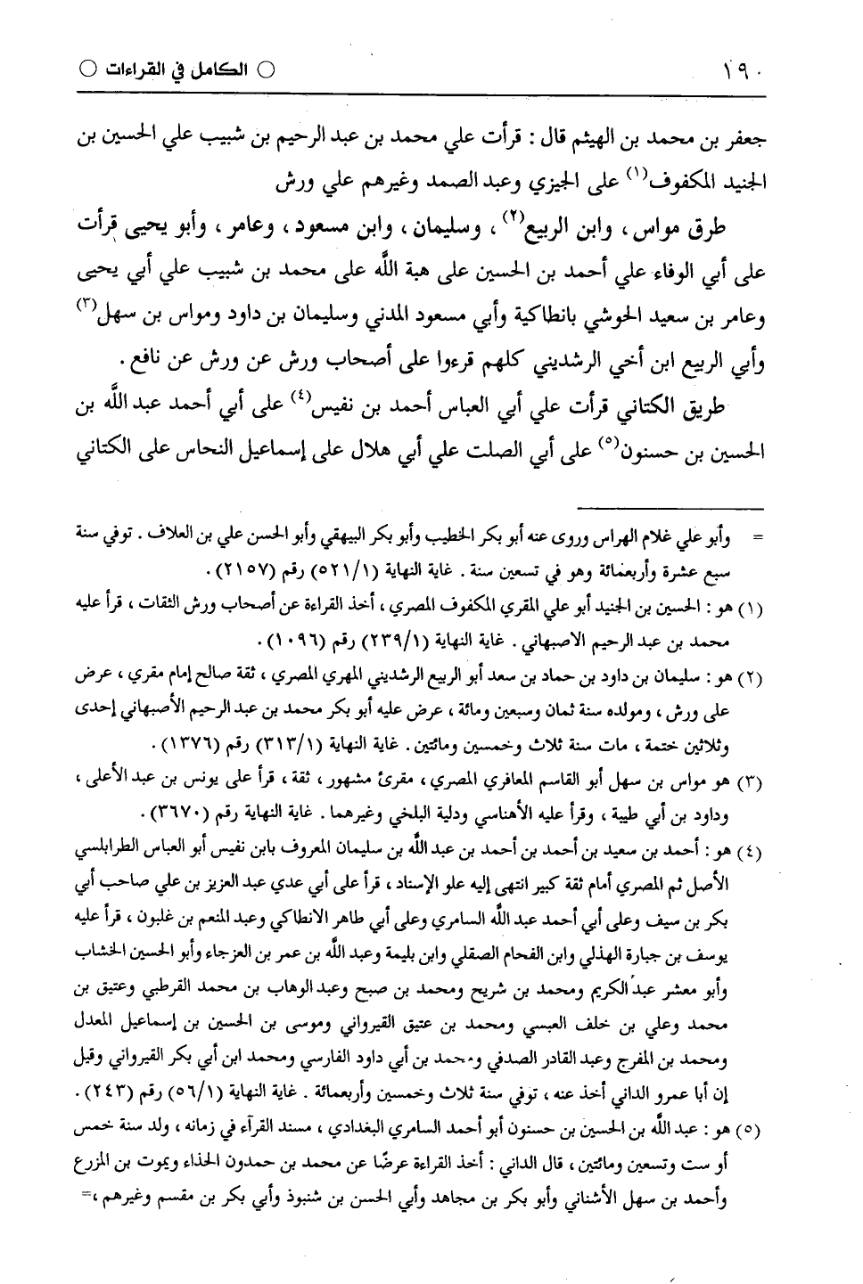 طرق مواس، وابن الربيع، وسليمان، وابن مسعود، وعامر، وأبو يحيى قرأت على أبي الوفاء علي أحمد بن الحسين على هبة اللَّه على محمد بْن شَبِيبٍ علي أبي يحيى وعامر بن سعيد الحوشي بإنطاكية وأبي مسعود المدني وسليمان بن داود ومواس بن سهل وأبي الربيع ابن أخي الرشديني كلهم قرءوا على أصحاب ورش عن ورش عن نافع. طريق الْكَتَّانِيّ قرأت علي أبي العباس أحمد بن نفيس على أبي أحمد عبد اللَّه بن الحسين بن حسنون على أبي الصلت علي أبي هلال على إسماعيل النحاس على الْكَتَّانِيّ