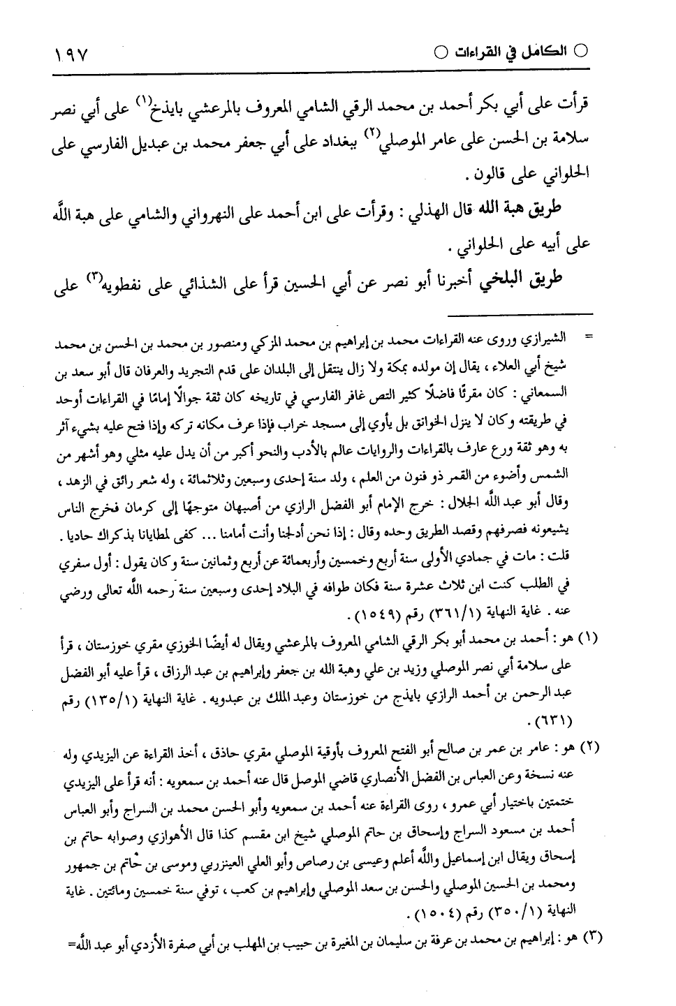 طريق هبه الله قال الْهُذَلِيّ: وقرأت على ابن أحمد على النهرواني والشامي على هبة اللَّه على أبيه على الحلواني.