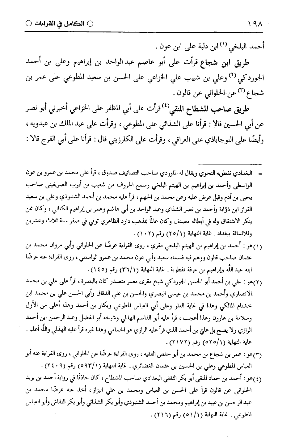 طريق صاحب المشطاح المنقي قرأت على أبي الْمُظَفَّر على الْخُزَاعِيّ أخبرني أبو نصر عن أبي الحسين قالا: قرأنا على الشَّذَائِيّ على الْمُطَّوِّعِيّ، وقرأت على عبد الملك بن عبدويه، وأيضًا على النَّوْجَابَاذِيّ على العراقي، وقرأت على الْكَارَزِينِيّ قال: قرأنا على أبي الفرج قالا: