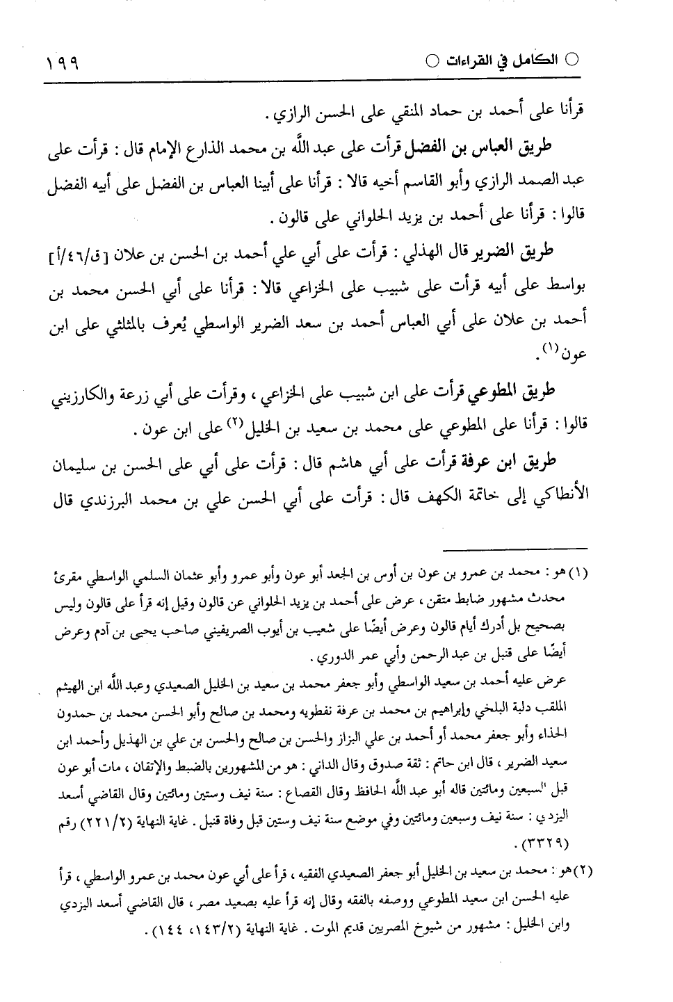 طريق العباس بن الفضل قرأت على عبد اللَّه بن محمد الذارع الإمام قال: قرأت على عبد الصمد الرَّازِيّ وأبو القاسم أخيه قالا: قرأنا على أبينا العباس بن الفضل على أبيه الفضل قالوا: قرأنا على أحمد بن يزيد الحلواني على قَالُون.