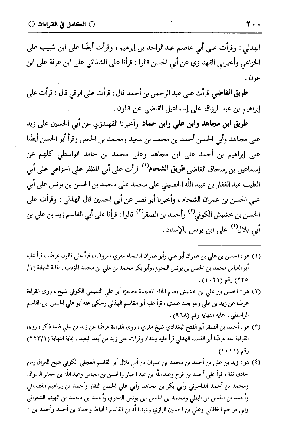 طريق ابن مجاهد وابن علي وابن حماد وأخبرنا الْقُهُنْدَزِيّ عن أبي الحسن على زيد على مجاهد وأبي الحسن أحمد بن محمد بن سعيد ومحمد بن الحسن وقرأ أبو الحسن أيضا على إبراهيم بن أحمد على ابن مجاهد وعلى محمد بن حامد الواسطي كلهم عن إسماعيل بن إسحاق القاضي طريق الشحام قرأت على أبي الْمُظَفَّر على الْخُزَاعِيّ على أبي الطيب عبد الغفار بن عبيد اللَّه الحصيني على محمد على محمد بن الحسن بن يونس على أبي علي الحسن بن عمران الشحام، وأخبرنا أبو نصر عن أبي الحسين قال الْهُذَلِيّ: وقرأت على الحسن بن خشيش الكوفي وأحمد بن الصقر قالوا: قرأنا على أبي القاسم زيد بن علي بن أبي بلال على ابن يونس بالإسناد.