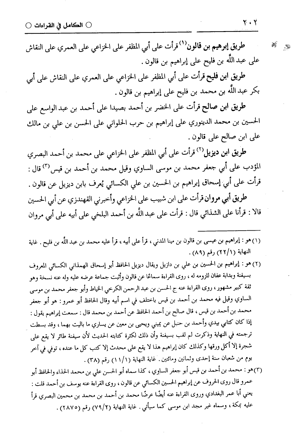 طريق إبرهيم بن قَالُون قرأت على أبي الْمُظَفَّر على الْخُزَاعِيّ على الْعُمَرِيّ على النَّقَّاش على عبد اللَّه بْن فُلَيْحٍ على إبراهيم بن قَالُون.