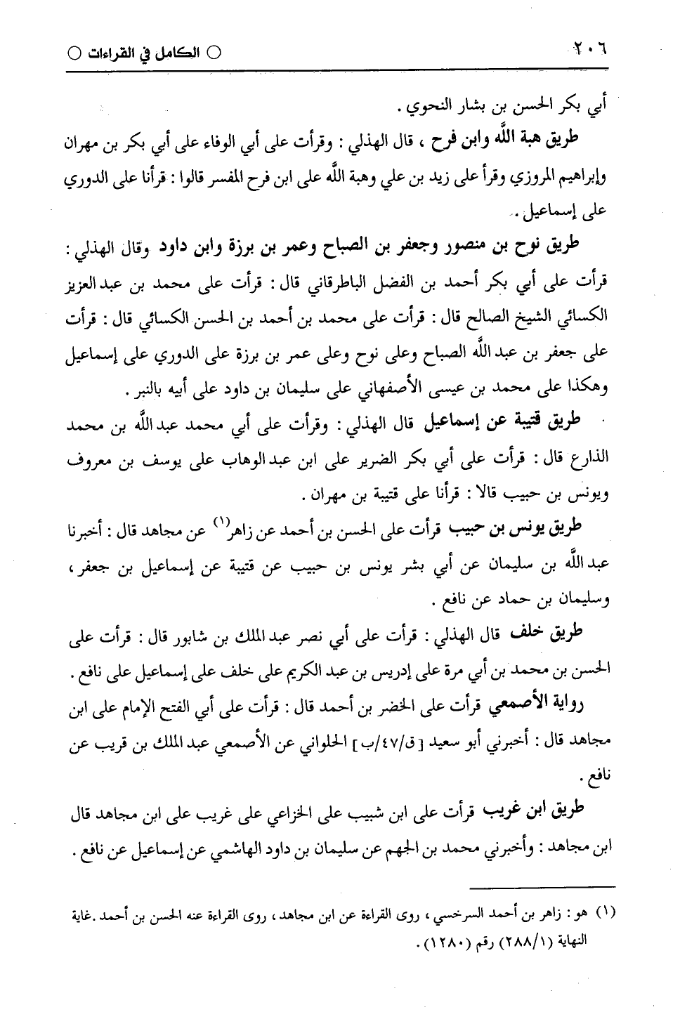 طريق خلف قال الْهُذَلِيّ: قرأت على أبي نصر عبد الملك بن شابور قال: قرأت على الحسن بن محمد بن أبي مرة على إدريس بن عبد الكريم على خلف على إسماعيل على نافع.