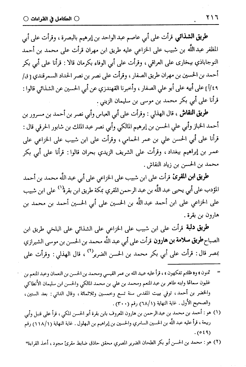 طريق دلبة قرأت على ابْن شَبِيبٍ على الْخُزَاعِيّ على الشَّذَائِيّ على الْبَلْخِيّ طريق ابن الصباح طريق سلامة بن هاررن قرأت على أبي عبد اللَّه محمد بن الحسن بن موسى الشيرازي بمصر قال: قرأت على أبي بكر محمد بن الحسن الضَّرِير، قال الْهُذَلِيّ: وقرأت على