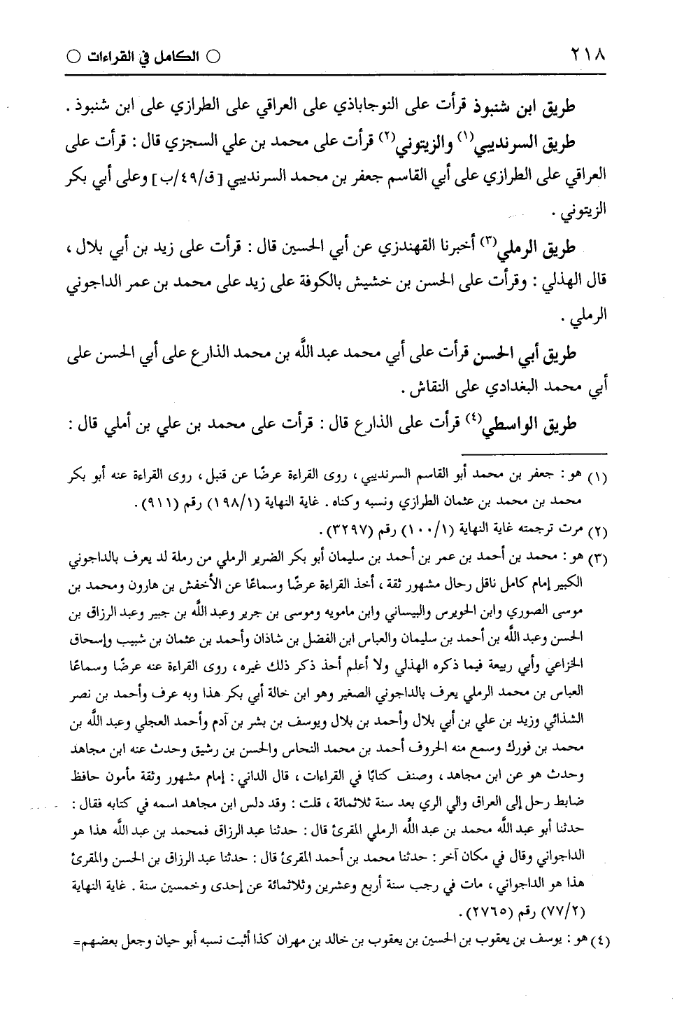 طريق ابْن شَنَبُوذَ قرأت على النَّوْجَابَاذِيّ على العراقي على الطرازي على ابْن شَنَبُوذَ.