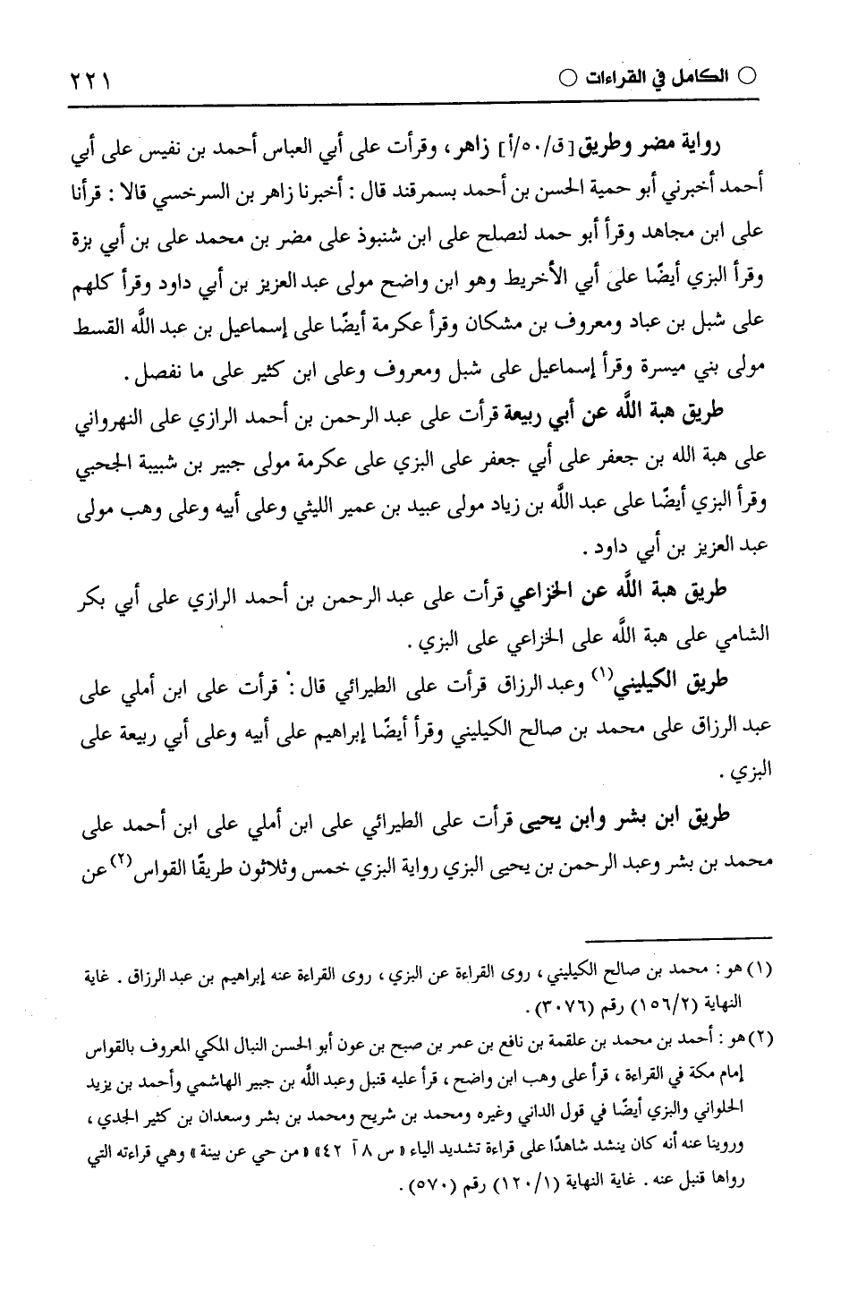 طريق ابن بشر وابن يحيى قرأت على الطَّيْرَائِيِّ على ابن أملي على ابن أحمد على محمد بن بشر وعبد الرحمن بن يحيى البزي رواية البزي خمس وثلاثون طريقا القواس عن