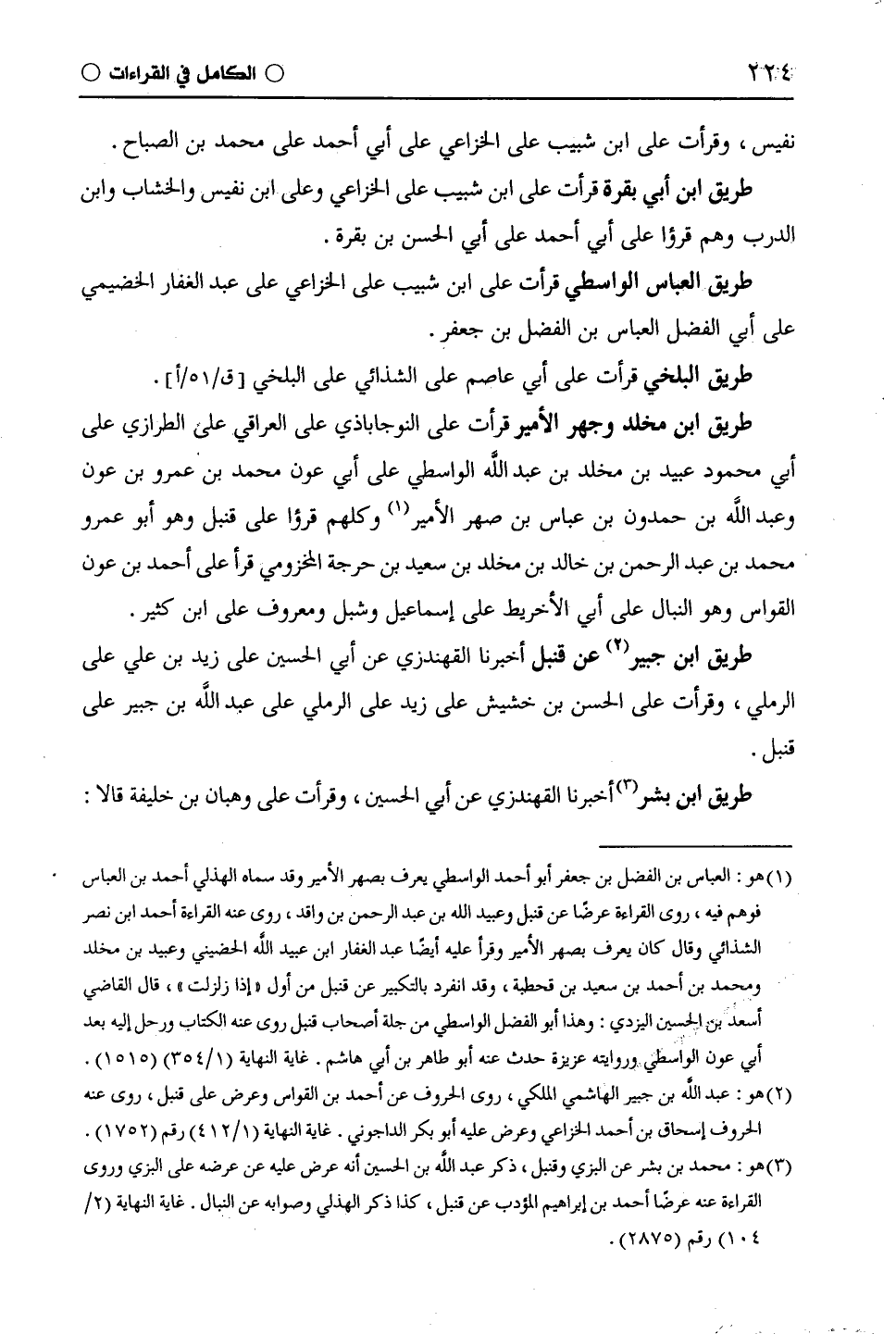 نفيس، وقرأت على ابْن شَبِيبٍ على الْخُزَاعِيّ على أبي أحمد على محمد بْن الصَّبَّاحِ. طريق ابن أبي بقرة قرأت على ابْن شَبِيبٍ على الْخُزَاعِيّ وعلى ابن نفيس والخشاب وابن الدرب وهم قرؤا على أبي أحمد على أبي الحسن ابْن بَقَرَةَ.