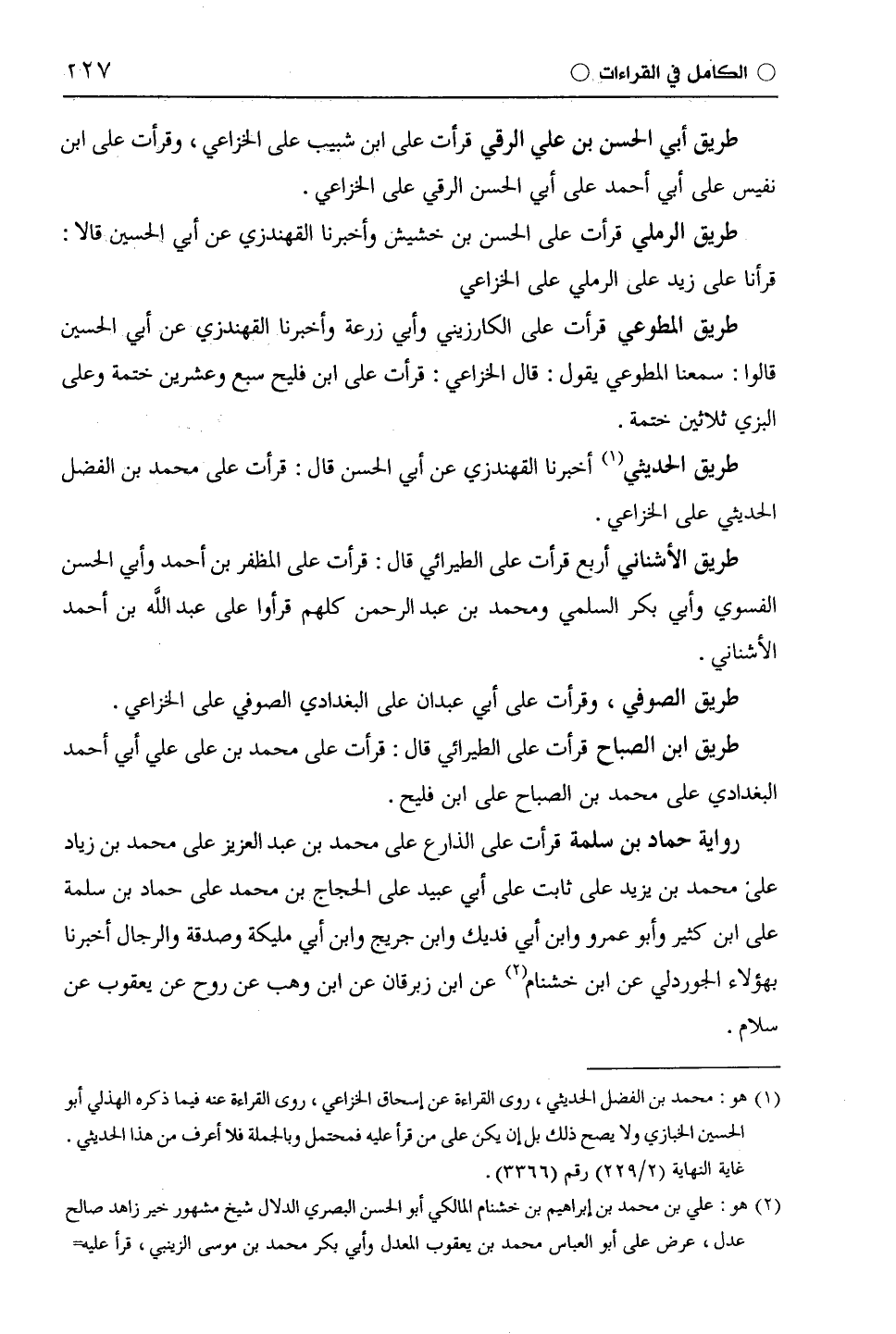 رواية حماد بن سلمة قرأت على الذارع على محمد بن عبد العزيز على محمد بن زياد على محمد بن يزيد على ثابت على أبي عبيد على الْحَجَّاج بن محمد على حماد بن سلمة على ابْن كَثِيرٍ وأَبُو عَمْرٍو وابن أبي فديك وابن جريج وابن أبي مليكة وصدقة والرجال أخبرنا بهؤلاء الجوردلي عن ابن خشنام عن ابن زبرقان عن ابن وهب عن روح عن يَعْقُوب عن سلام.