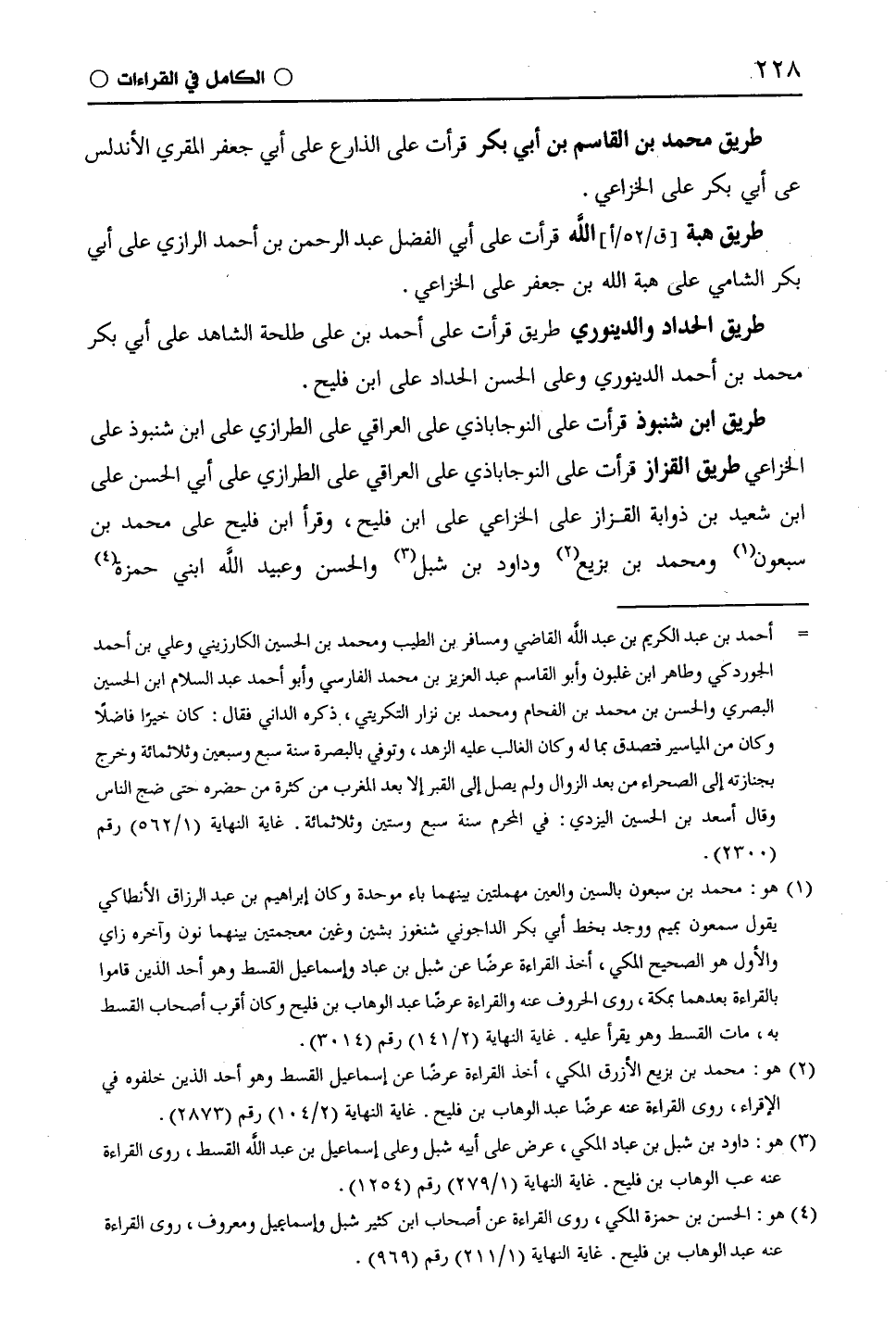 طريق ابْن شَنَبُوذَ قرأت على النَّوْجَابَاذِيّ على العراقي على الطرازي على ابْن شَنَبُوذَ على الْخُزَاعِيّ طريق القزاز قرأت على النَّوْجَابَاذِيّ على العراقي على الطرازي على أبي الحسن على ابن سعيد بن ذوابة القزاز على الْخُزَاعِيّ على ابْن فُلَيْحٍ، وقرأ ابْن فُلَيْحٍ على محمد بن سبعون ومحمد بن بزيغ وداود بن شِبْل والحسن وعبيد اللَّه ابني حَمْزَة
