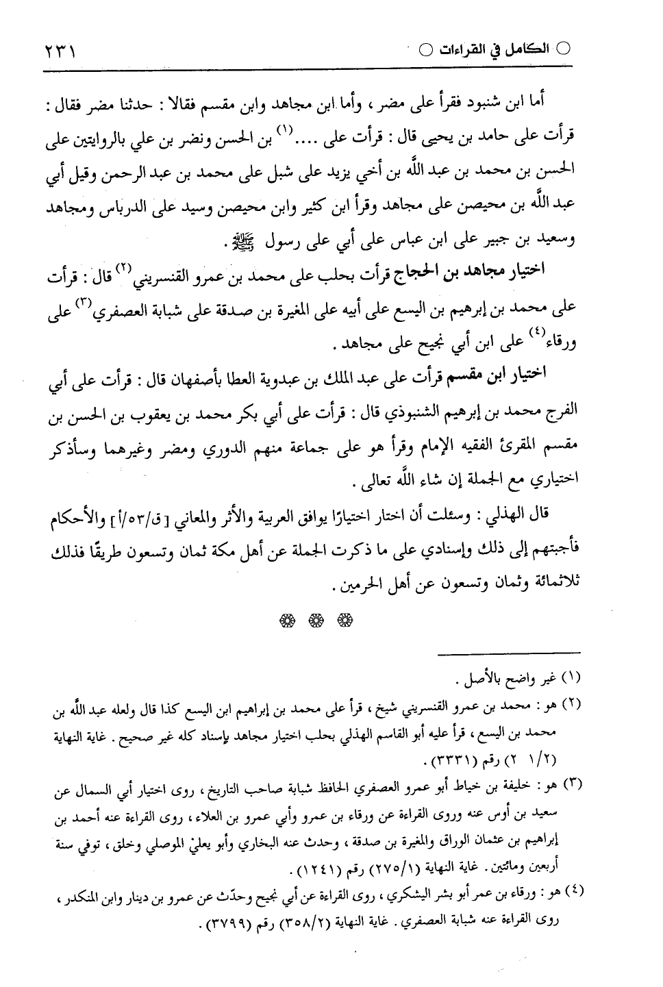 أما ابن شنبود فقرأ على مضر، وأما ابن مجاهد وابْن مِقْسَمٍ فقالا: حدثنا مضر فقال: قرأت على حامد بن يحيى قال: قرأت على [ ... ] (¬1) بن الحسن ونضر بن علي بالروايتين على الحسن بن محمد بن عبد اللَّه بن أخي يزيد على شِبْل على محمد بن عبد الرحمن وقيل أبي عبد اللَّه بن مُحَيْصِن على مجاهد وقرأ ابْن كَثِيرٍ وابن مُحَيْصِن وسيد على الدرباس ومجاهد وسعيد بن جبير على ابن عباس على أبي على رسول اللَّه - صلى الله عليه وسلم - اختيار مجاهد بن الْحَجَّاج قرأت بحلب على محمد بن عمرو القنسريني قال: قرأت على محمد بن إبرهيم بن اليسع على أبيه على المغيرة بن صدقة على شبابة العصفري على ورقاء على ابن أبي نجيح على مجاهد.