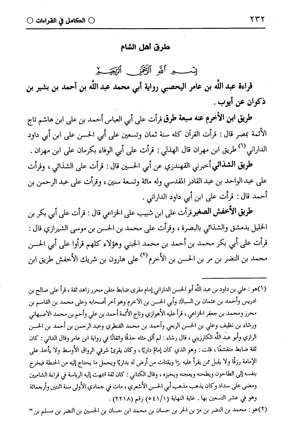 قراءة عبد اللَّه بن عامر اليحصبي رواية أبي محمد عبد اللَّه بن أحمد بن بشير بن ذكوان عن أيوب.