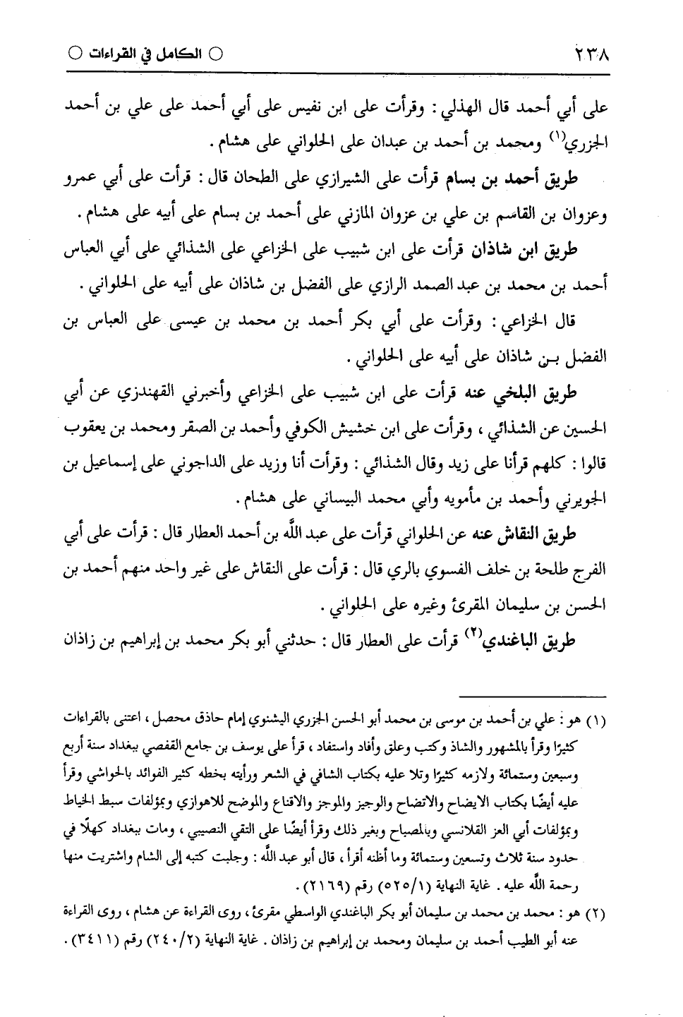 على أبي أحمد قال الْهُذَلِيّ: وقرأت على ابن نفيس على أبي أحمد على علي بن أحمد الجزري ومحمد بن أحمد بن عبدان على الحلواني على هشام.