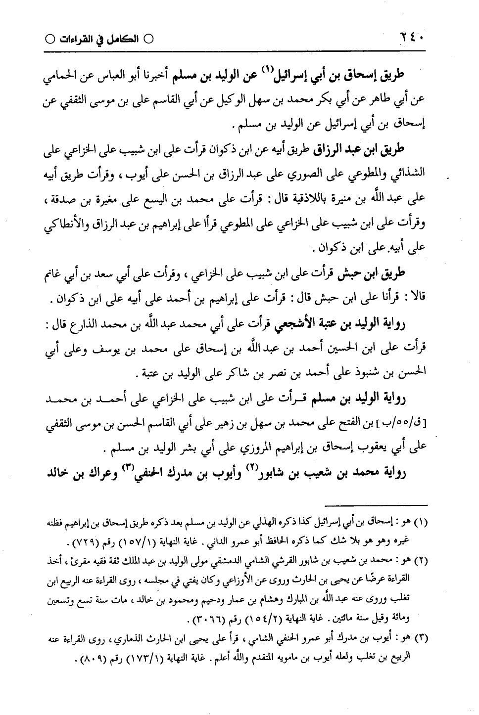 رواية الوليد بن مسلم قرأت على ابْن شَبِيبٍ على الْخُزَاعِيّ على أحمد بن محمد بن الفتح على محمد بن سهل بن زهير على أبي القاسم الحسن بن موسى الثقفي على أبي يَعْقُوب إسحاق بن إبراهيم المروزي على أبي بشر الوليد بن مسلم. رواية محمد بن شعيب بن شابور وأيوب بن مدرك الحنفي وعراك بن خالد