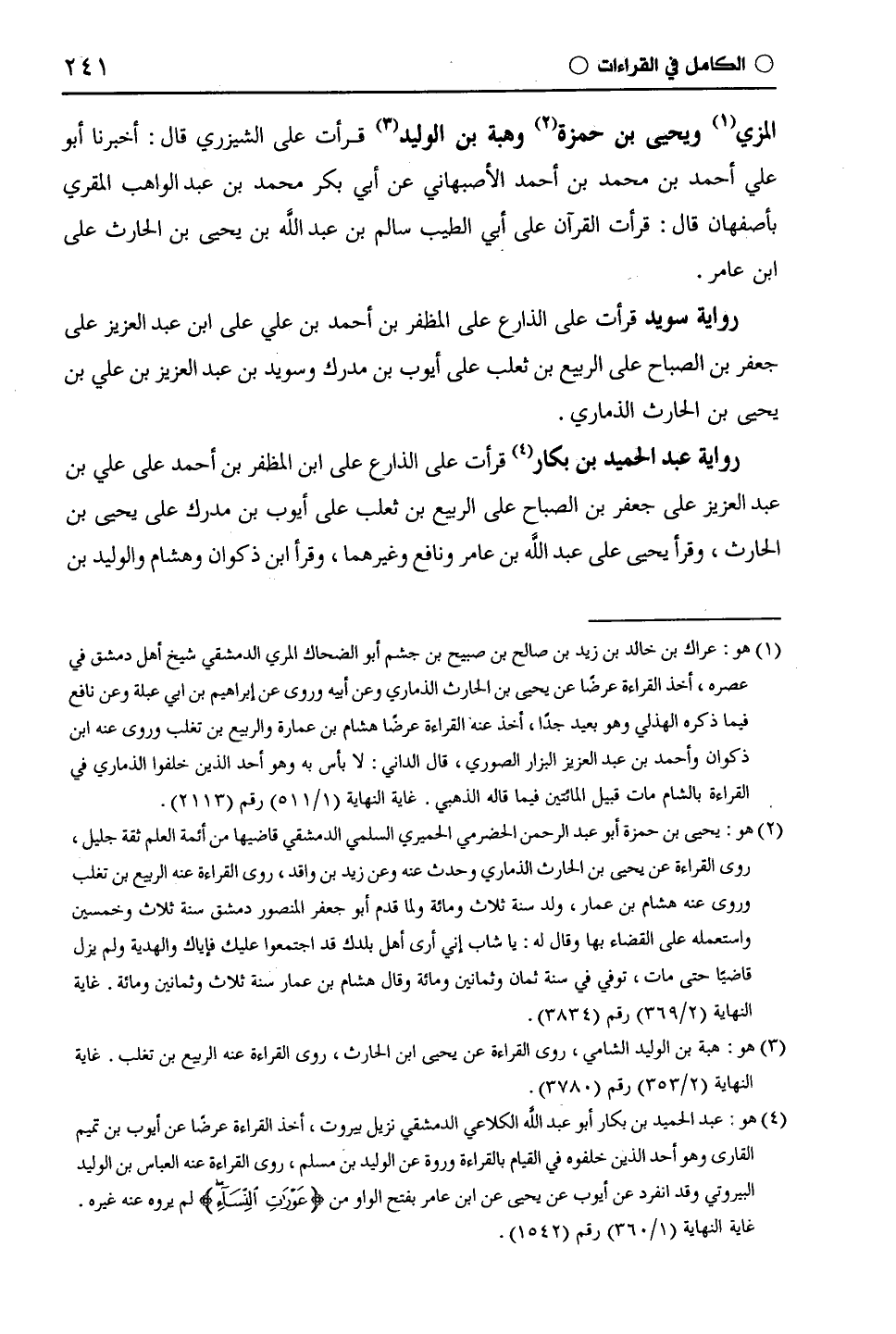 المزي ويحيى بن حَمْزَة وهبة بن الوليد قرأت على الشيزري قال: أخبرنا أبو علي أحمد بن محمد بن أحمد الأصبهاني عن أبي بكر محمد بن عبد الواهب المقري بأصفهان قال: قرأت القرآن على أبي الطيب سالم بن عبد اللَّه بن يحيى بن الحارث على ابن عامر.
